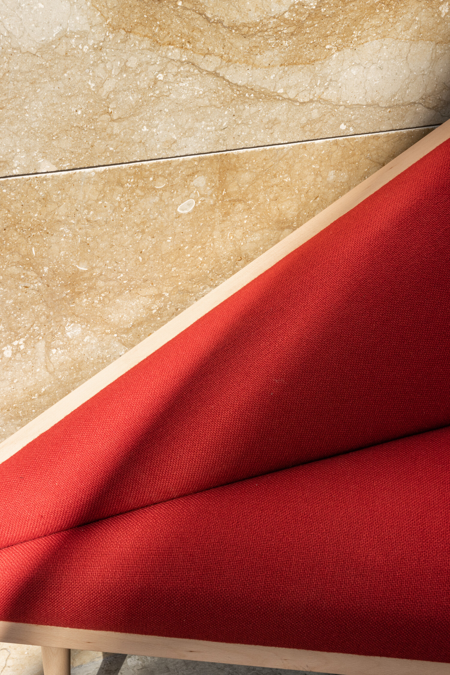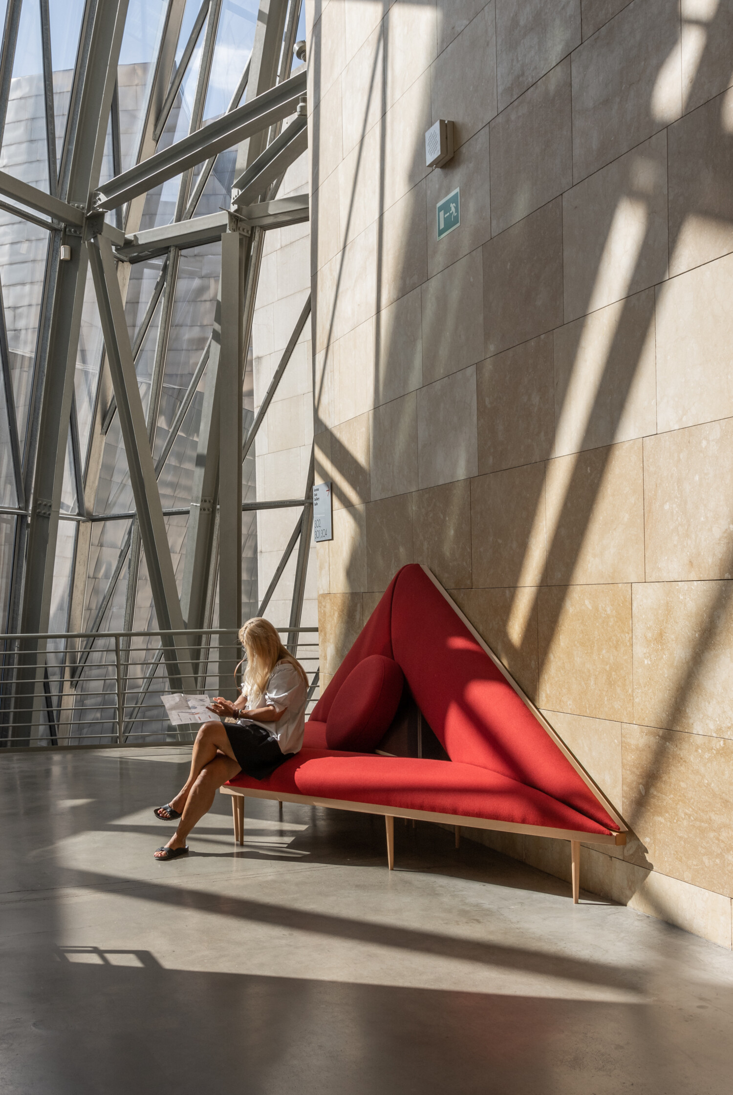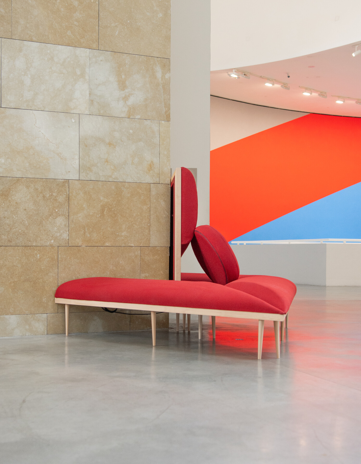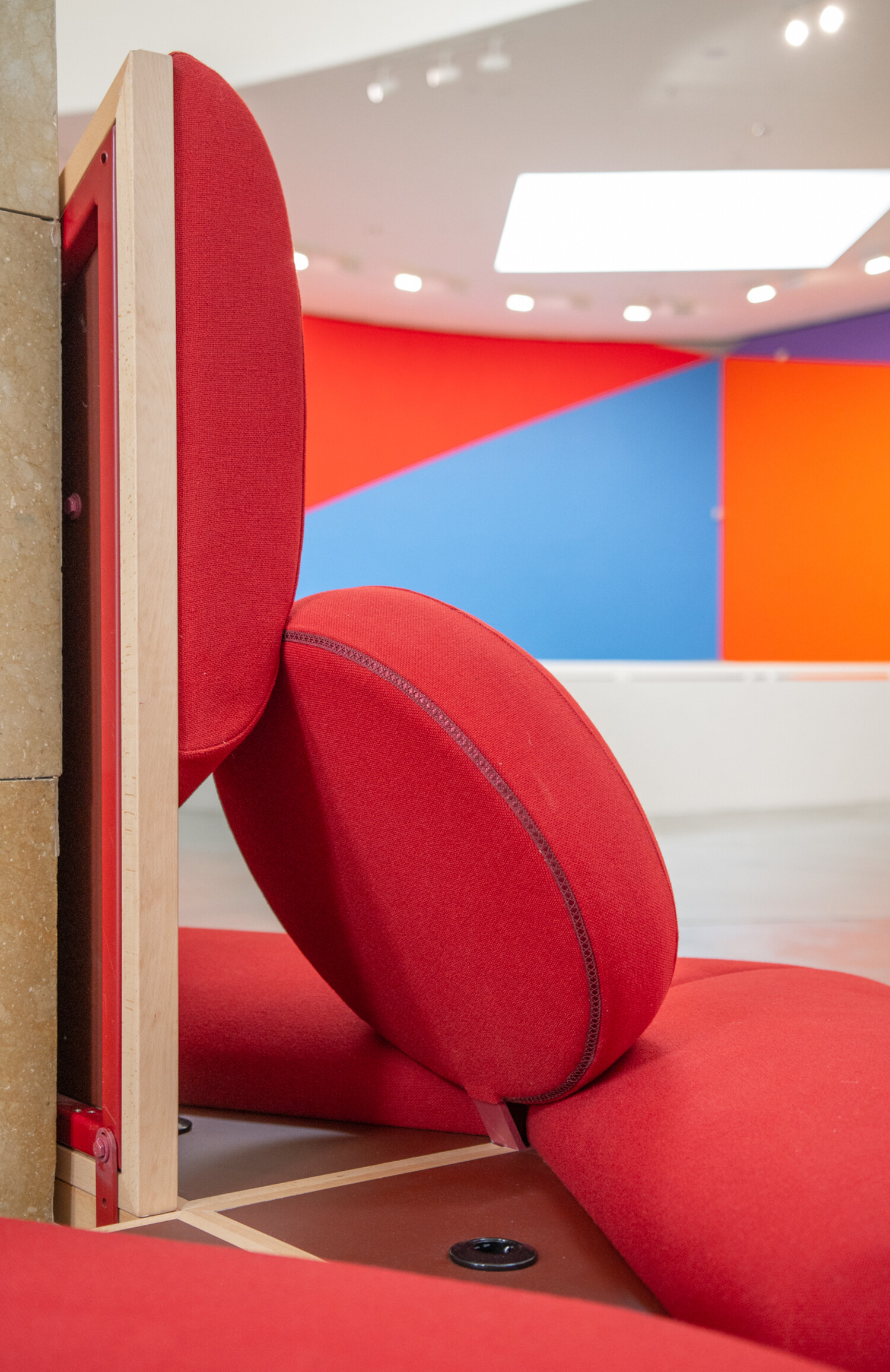 The intense colour of the piece, in contrast with the floor and walls, facilitates its perception. The red upholstery integrates with the definition of other original furniture elements of the museum, the ones in the bistro, in the auditorium...