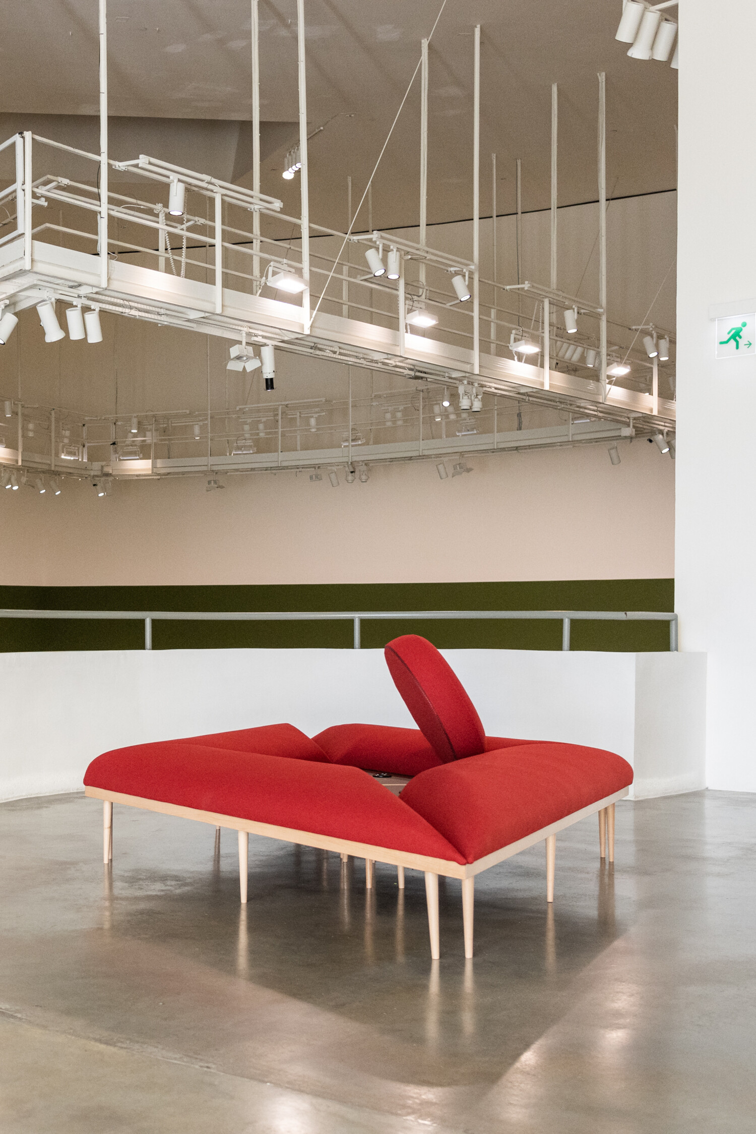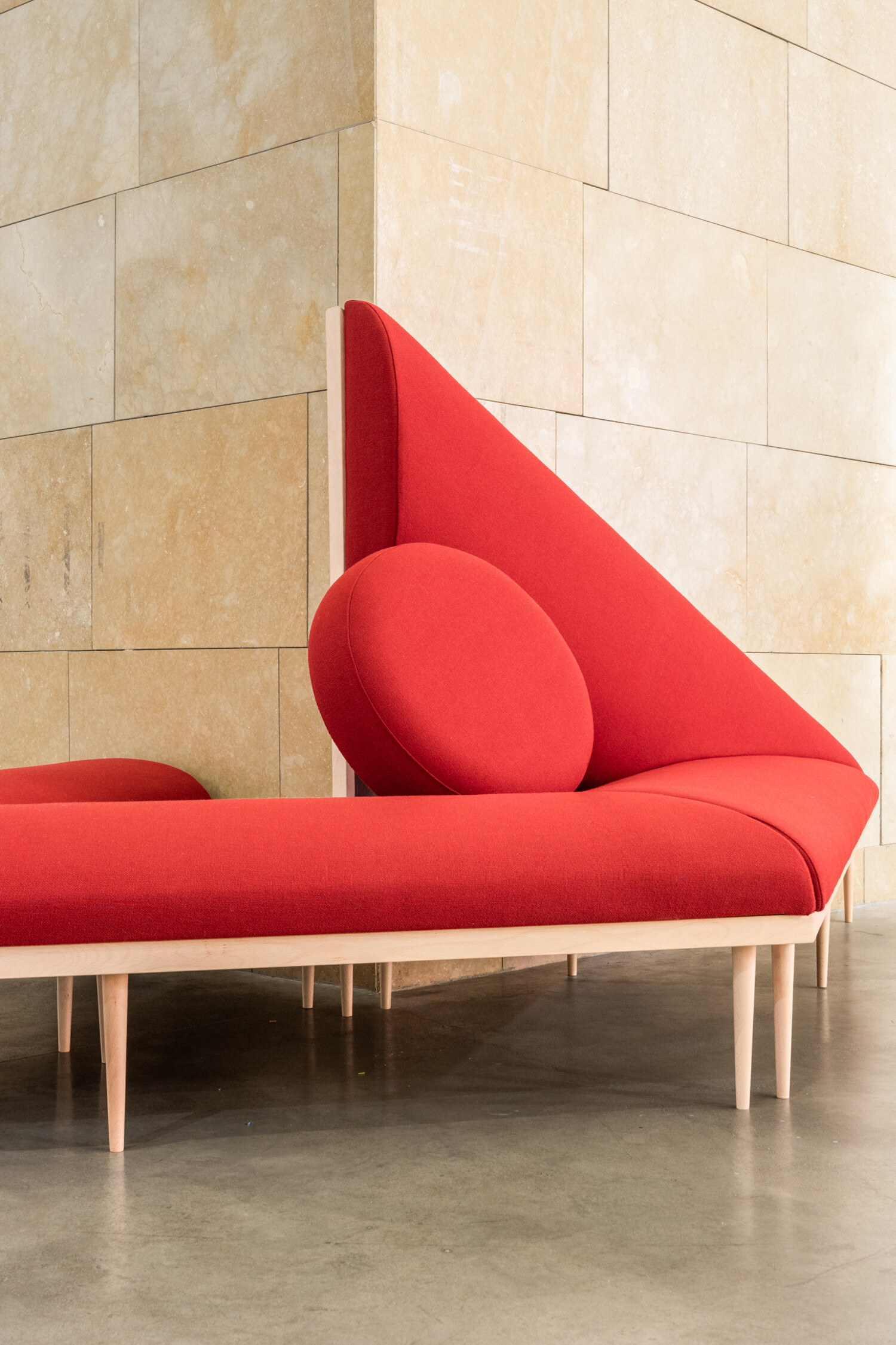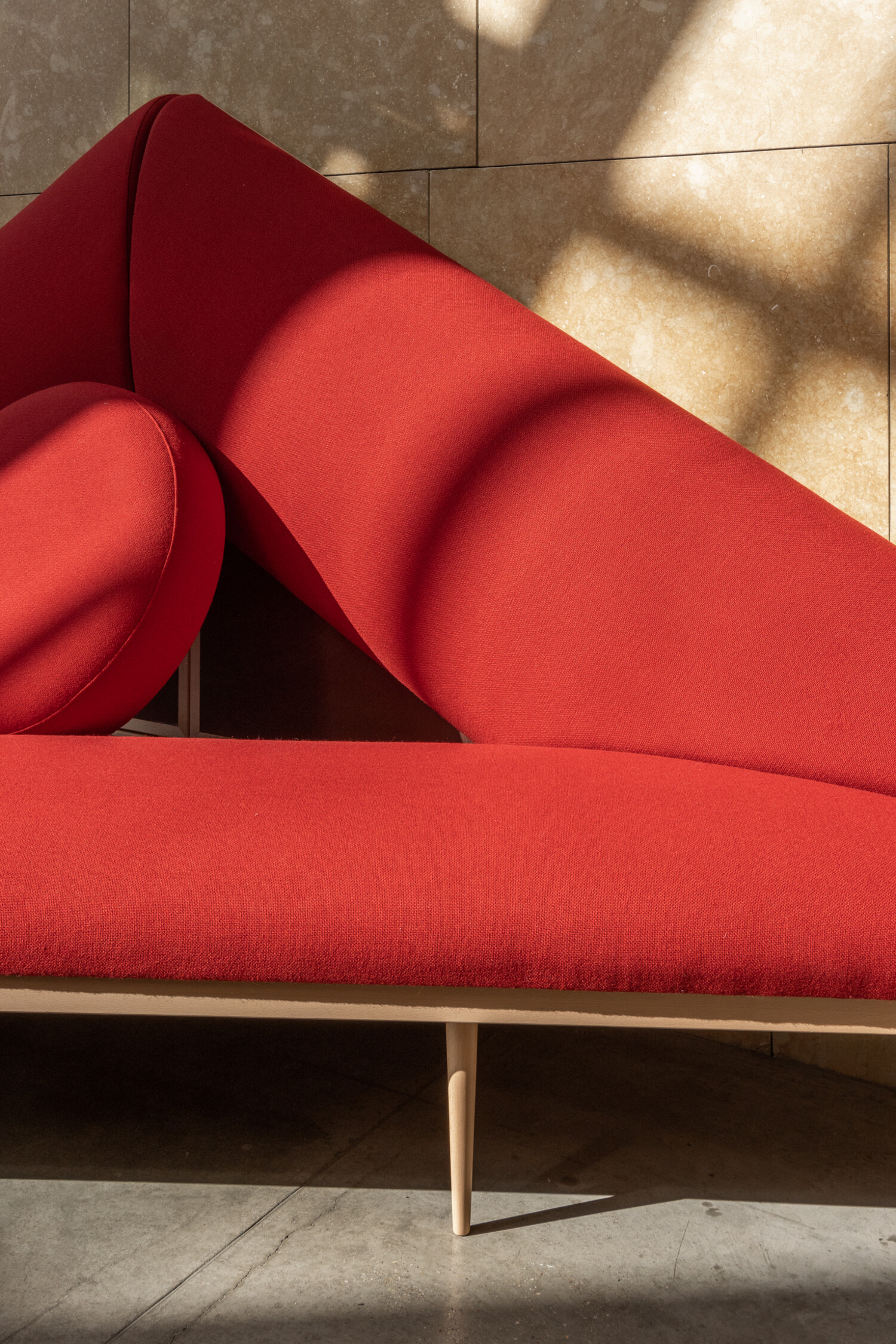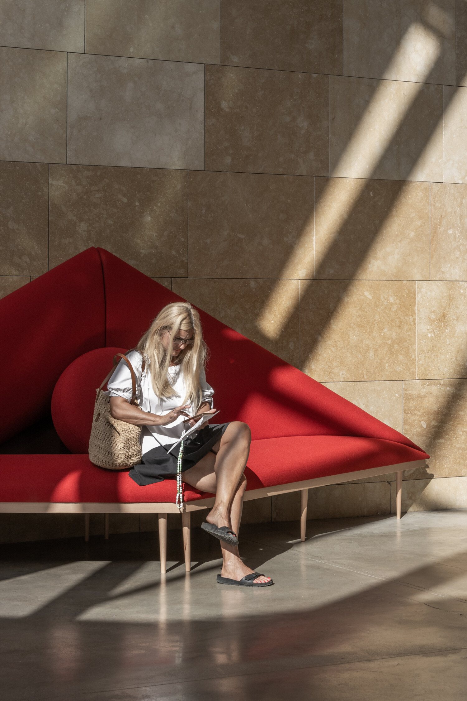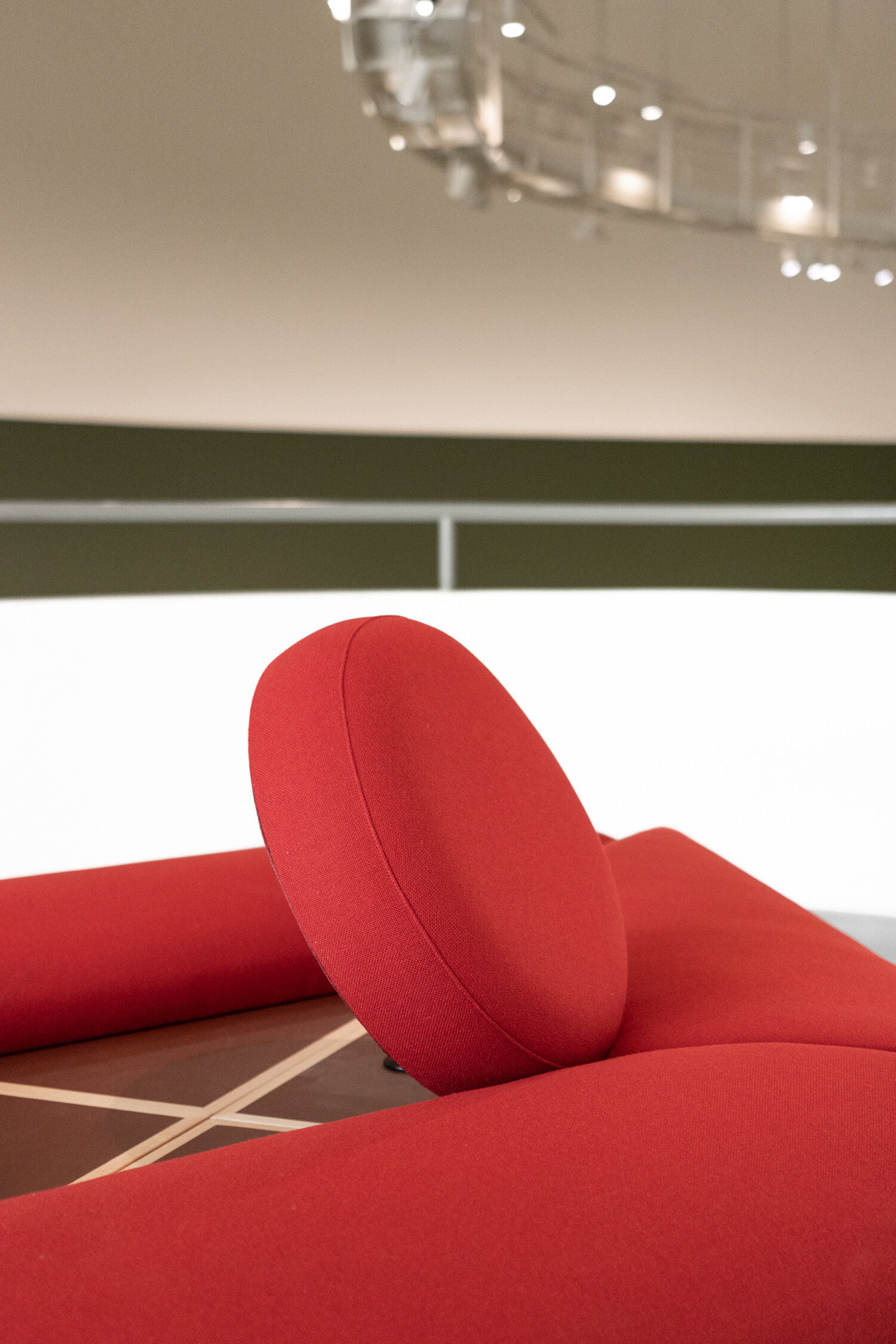 The intense colour of the piece, in contrast with the floor and walls, facilitates its perception. The red upholstery integrates with the definition of other original furniture elements of the museum, the ones in the bistro, in the auditorium...