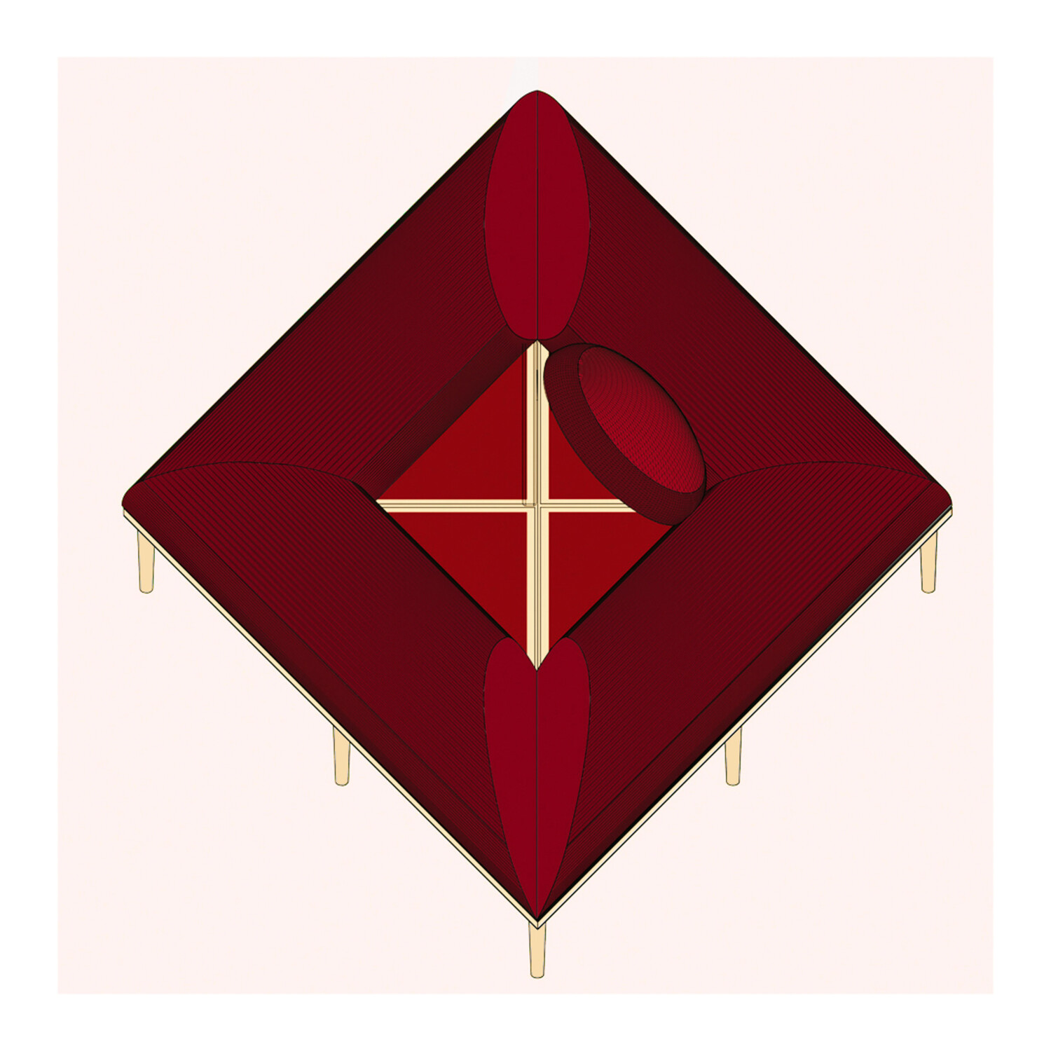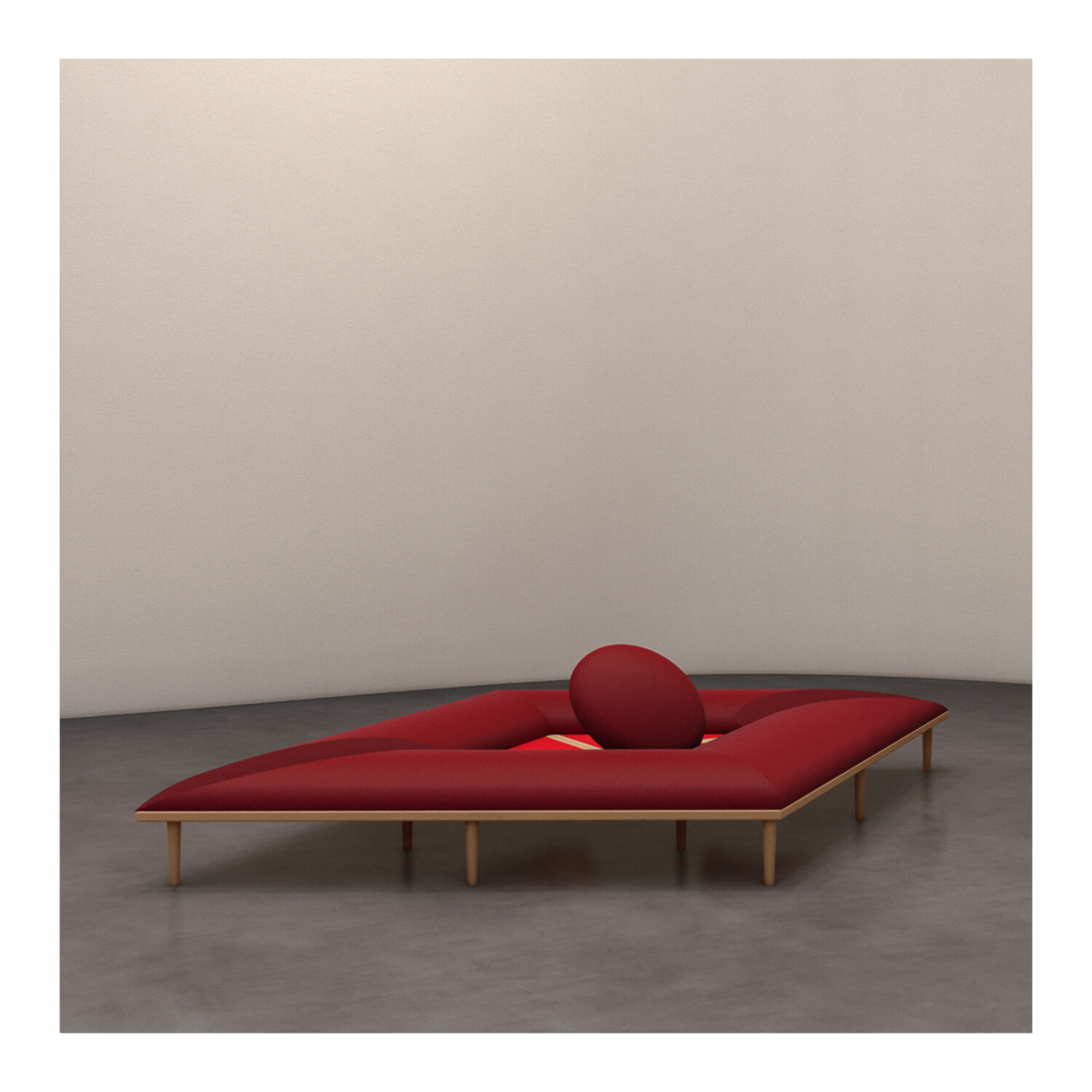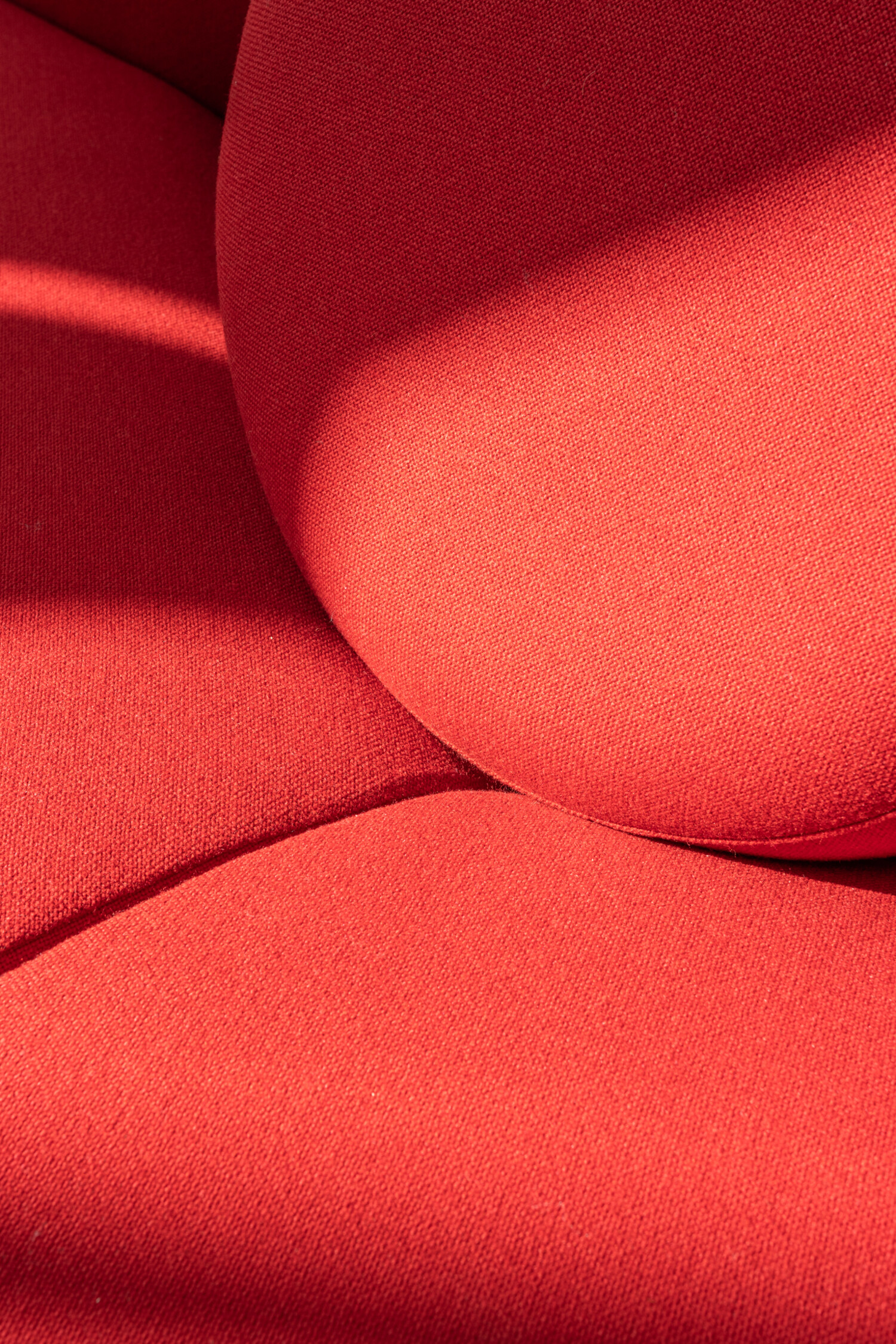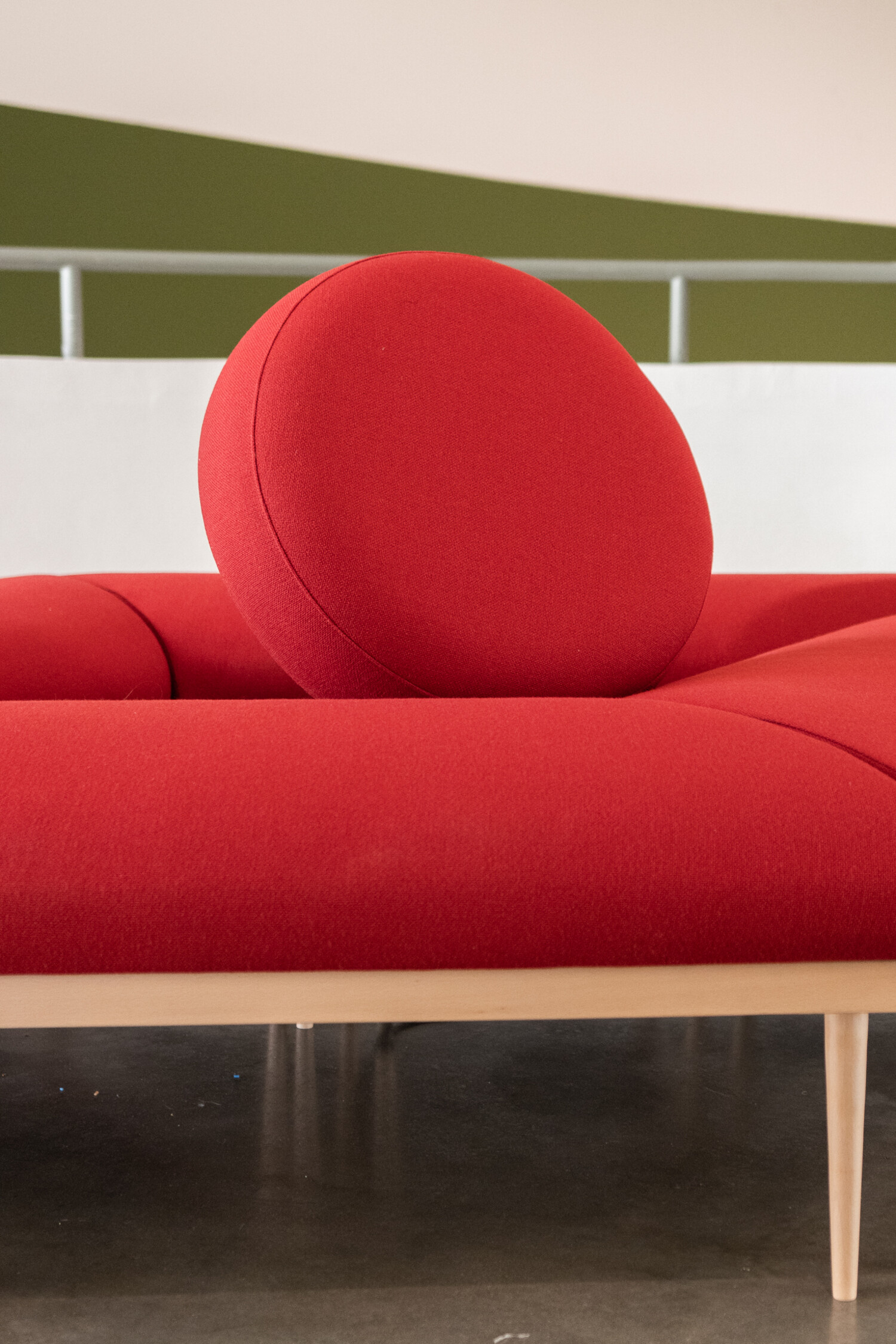 The intense colour of the piece, in contrast with the floor and walls, facilitates its perception. The red upholstery integrates with the definition of other original furniture elements of the museum, the ones in the bistro, in the auditorium...