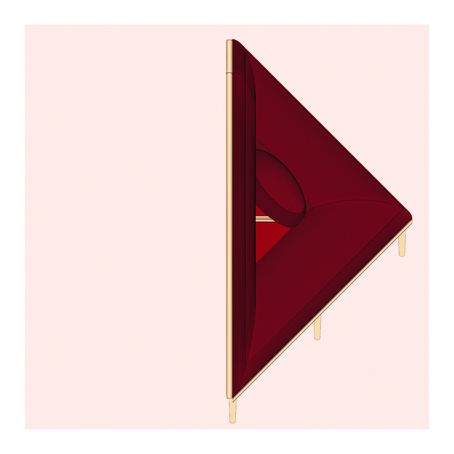 Metallic structure, legs and visible edge frame in beech wood, phenolic board and upholstered elements define the materiality.