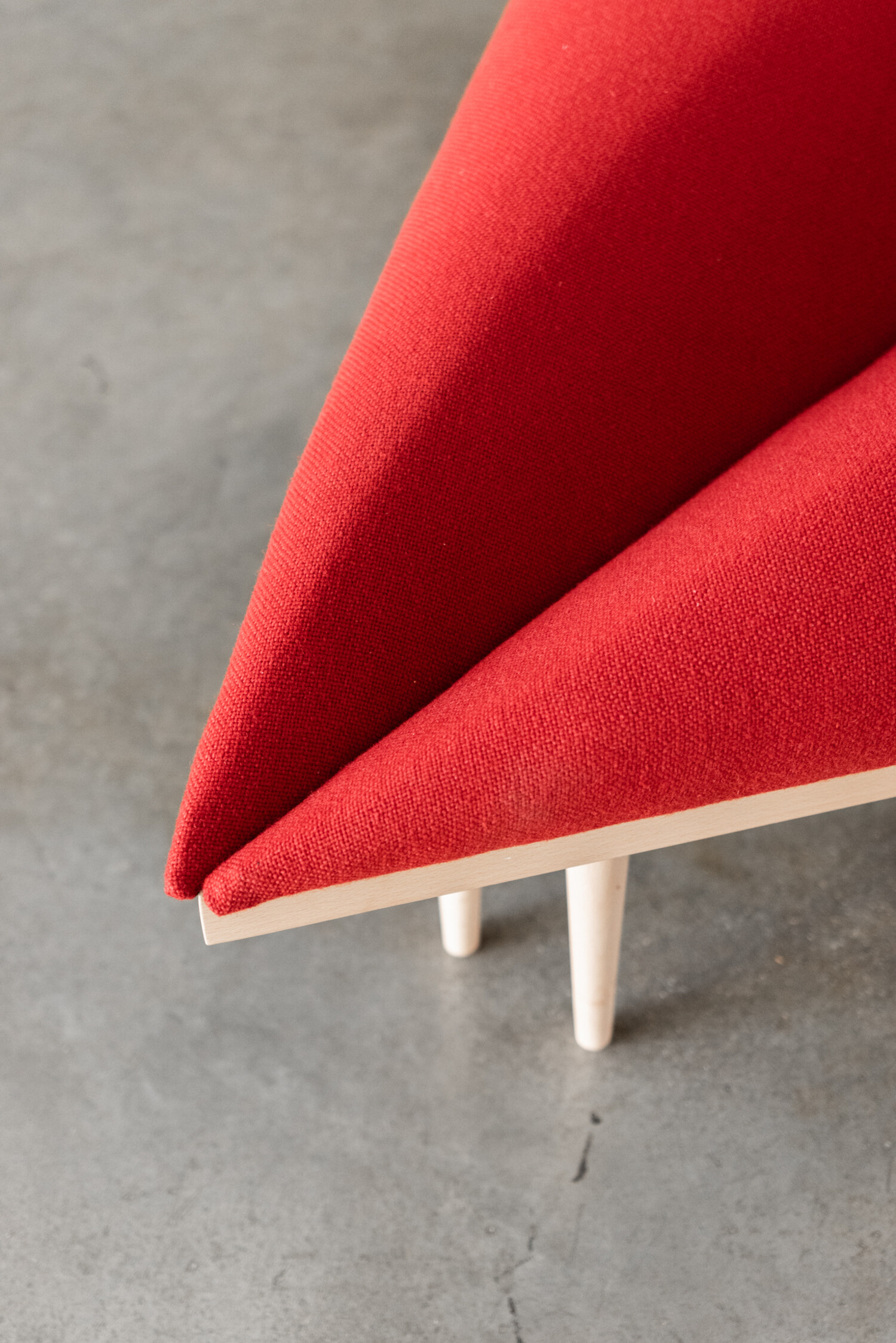 The set of upholstered elements, seat and back, padded and finished in red upholstery define the tactile and visual finish.