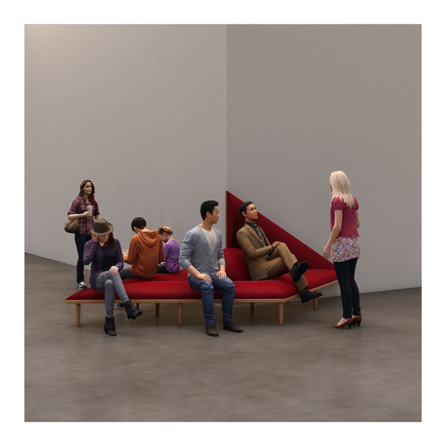 Its own formalization of faceted edges generates an environment around the assembly. This formalization adapted to the circumstances of the space with its own formal and geometric presence favours the gathering of the public, the perception of occupation of a specific and independent place from the general circulation space.