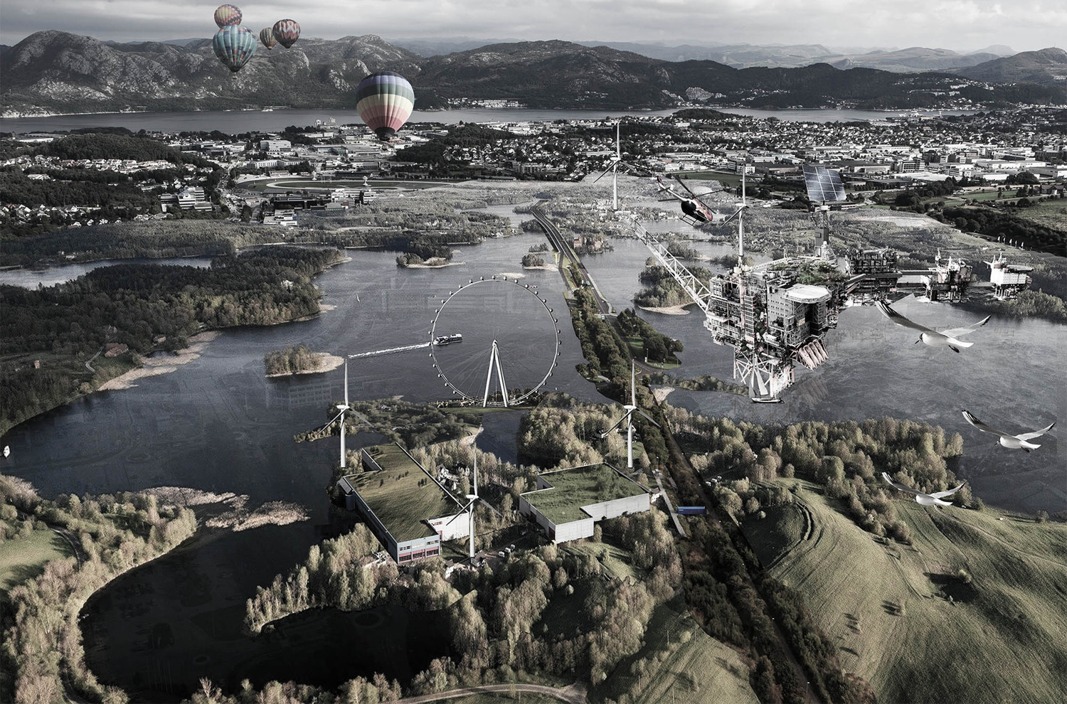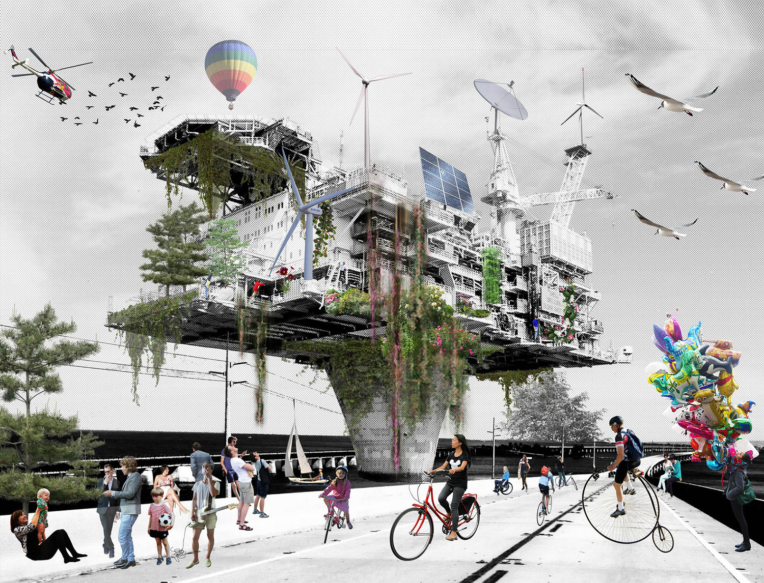The oil platform is seen in this proposal as the symbol of identity that deserves to be recycled under a different way, as a hybrid model with compatible uses.