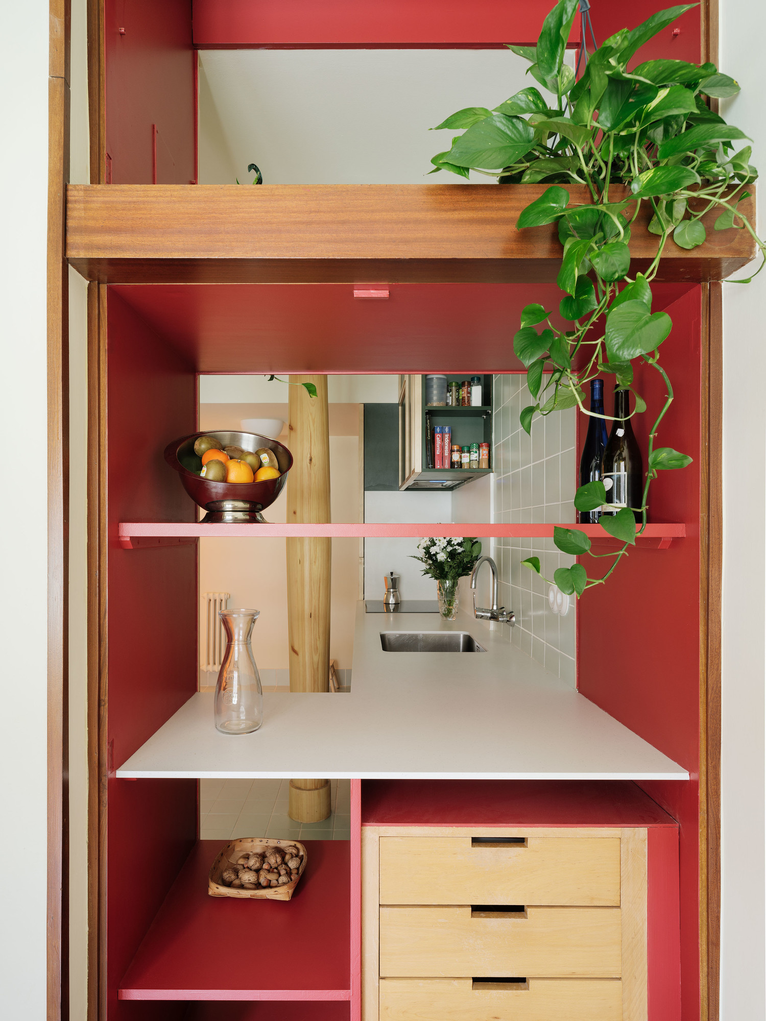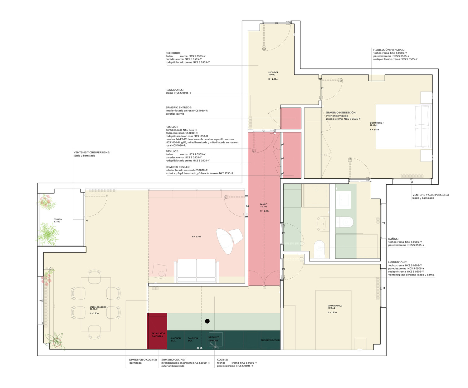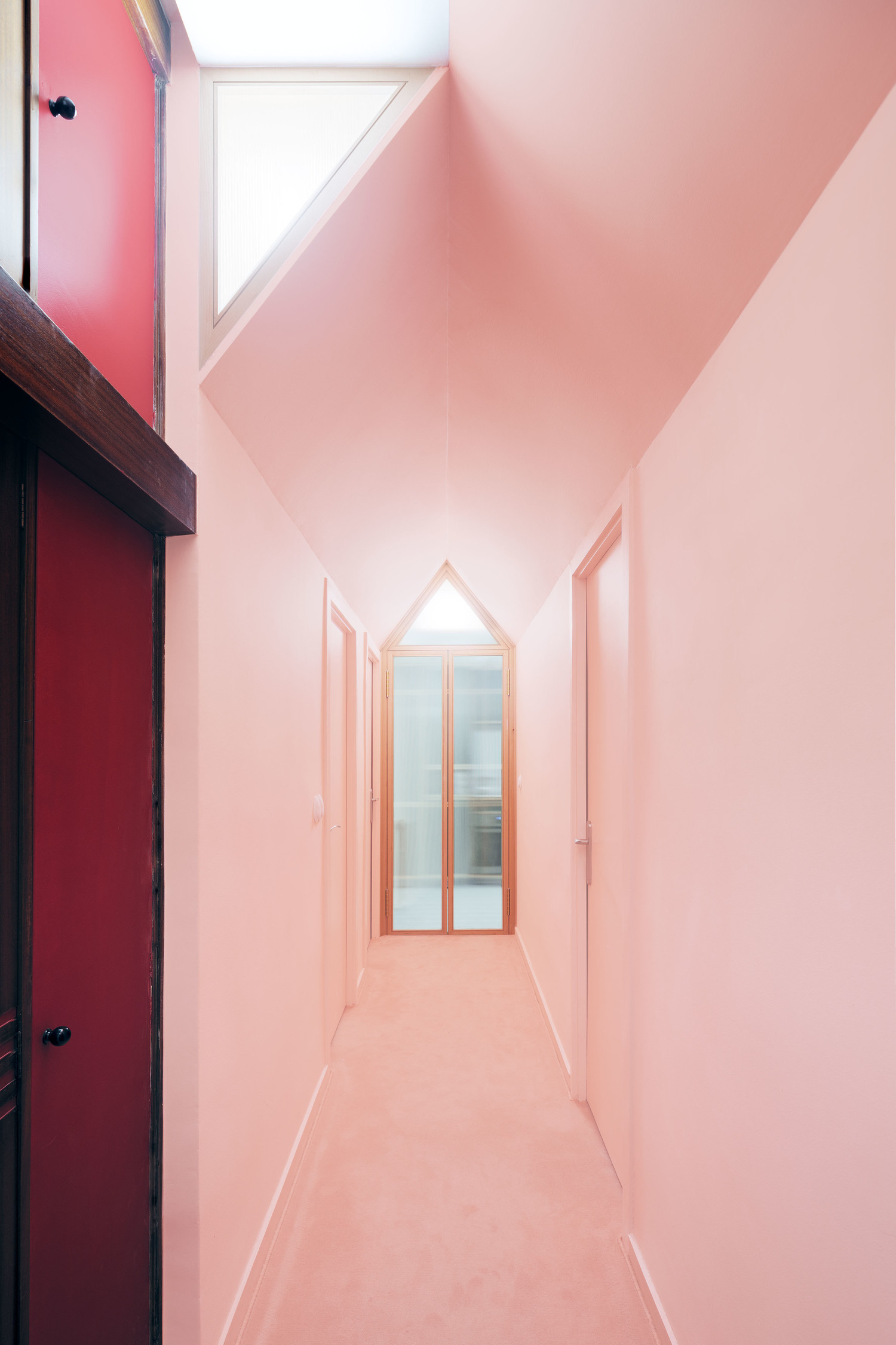 _ to change the interior corridor into a trigger of the house by connoting it with an archetypal section to two water, which allows on the one hand the registered passage of facilities and on the other the generation of two entrances of overhead light. This associated with the intensive use of pink in walls, doors and carpet, transforming the intestine of the house into a kind of abstract atmosphere of optimism and possibilities, which allows to escape from the null and void relationship of the apartment with the outside.