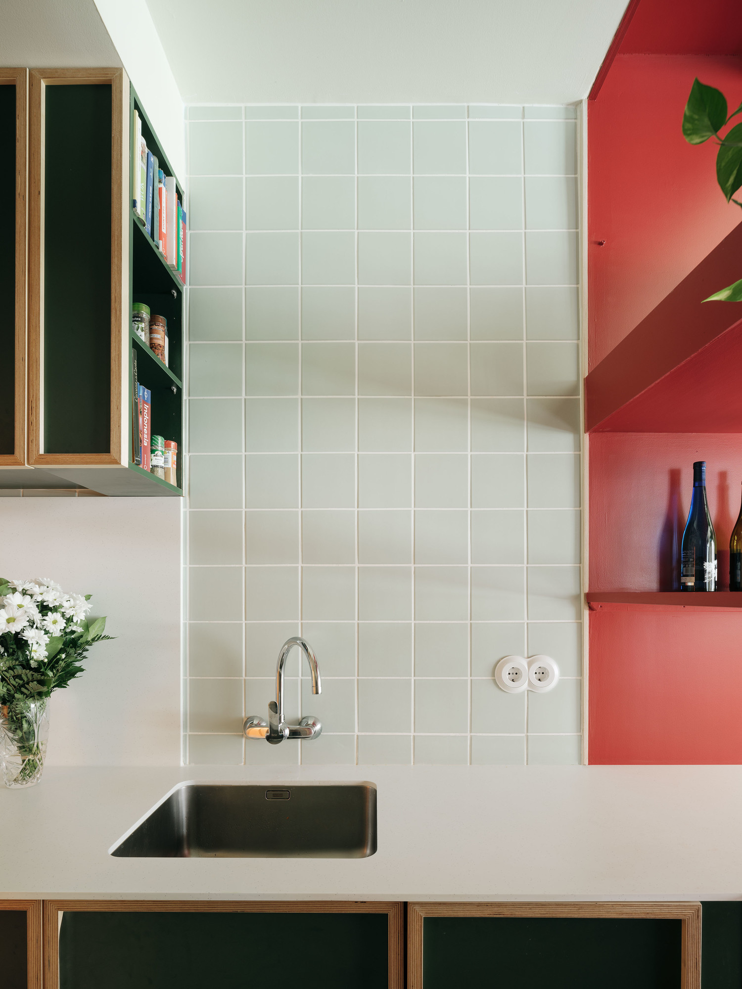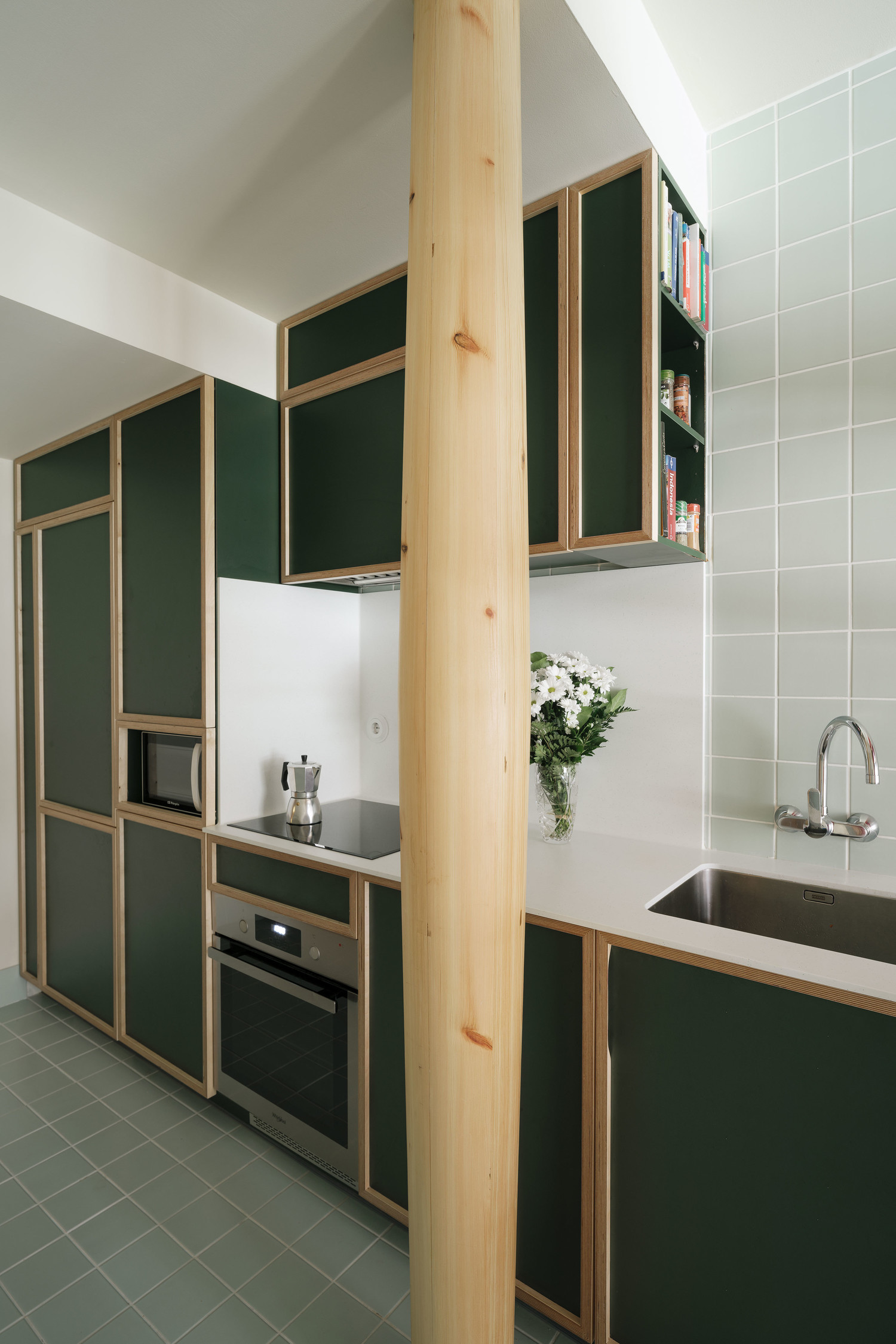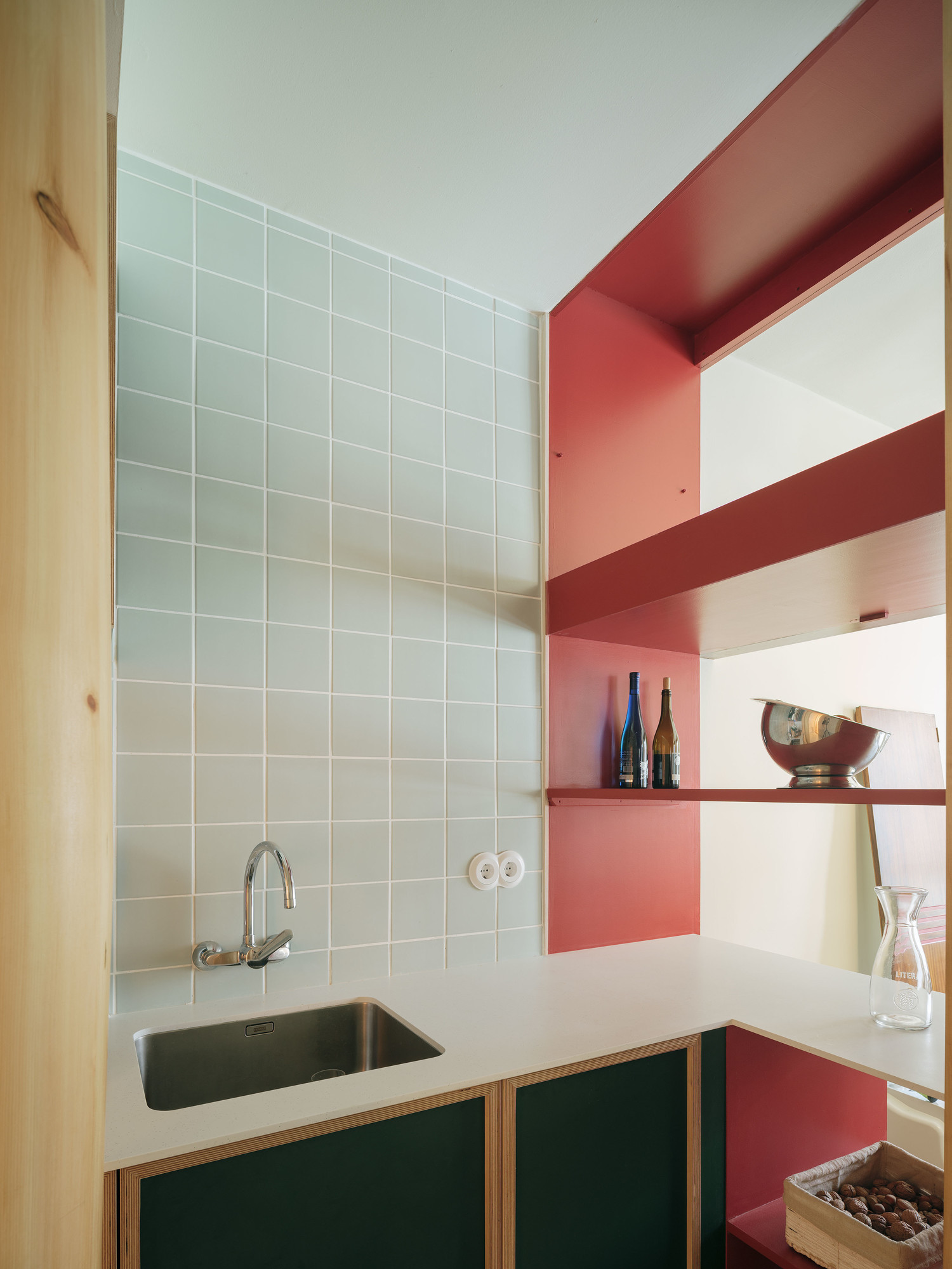 On the mezzanine of a building without great attributes of the 70s next to one of the new expansion areas of Bilbao a small interior apartment hides itself streching its floor between two courtyards. What is raised here is a radical exercise in archaeology that aims to grab the intervention with the value of the original elements of carpentry that run through the house. In this way, the functions of the house are updated reusing the inheritances of the house and establishes an interior connector axis through a theatrical corridor that aims to supply the connection with the exterior through the intensive use of form and color.