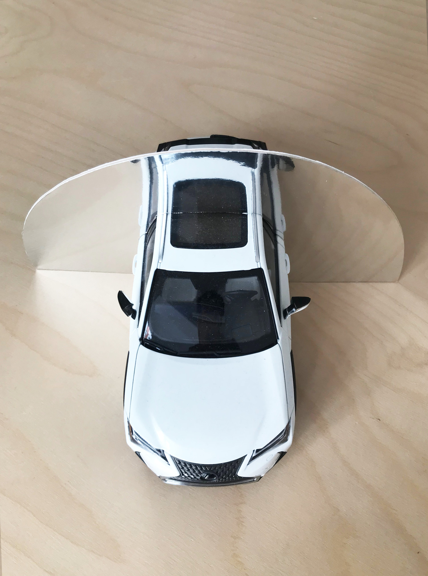 The intervention consists of the installation of a large semicircle that emulates that Japanese heritage of the rising sun and that, built in polished stainless steel sheet with mirror shine, is inserted flat in the middle of the vehicle. This dematerialized and at the same time present intervention manages to alter the perception of the vehicle without introducing elements alien to it through its discontinuities and duplicates of its reflection and environment. Thus, the car doubles its front at a first glance, rises in its entirety on the side where the piece is reduced to a line and is duplicated again from a rear glance where the broken geometry is accentuated in the reflection.