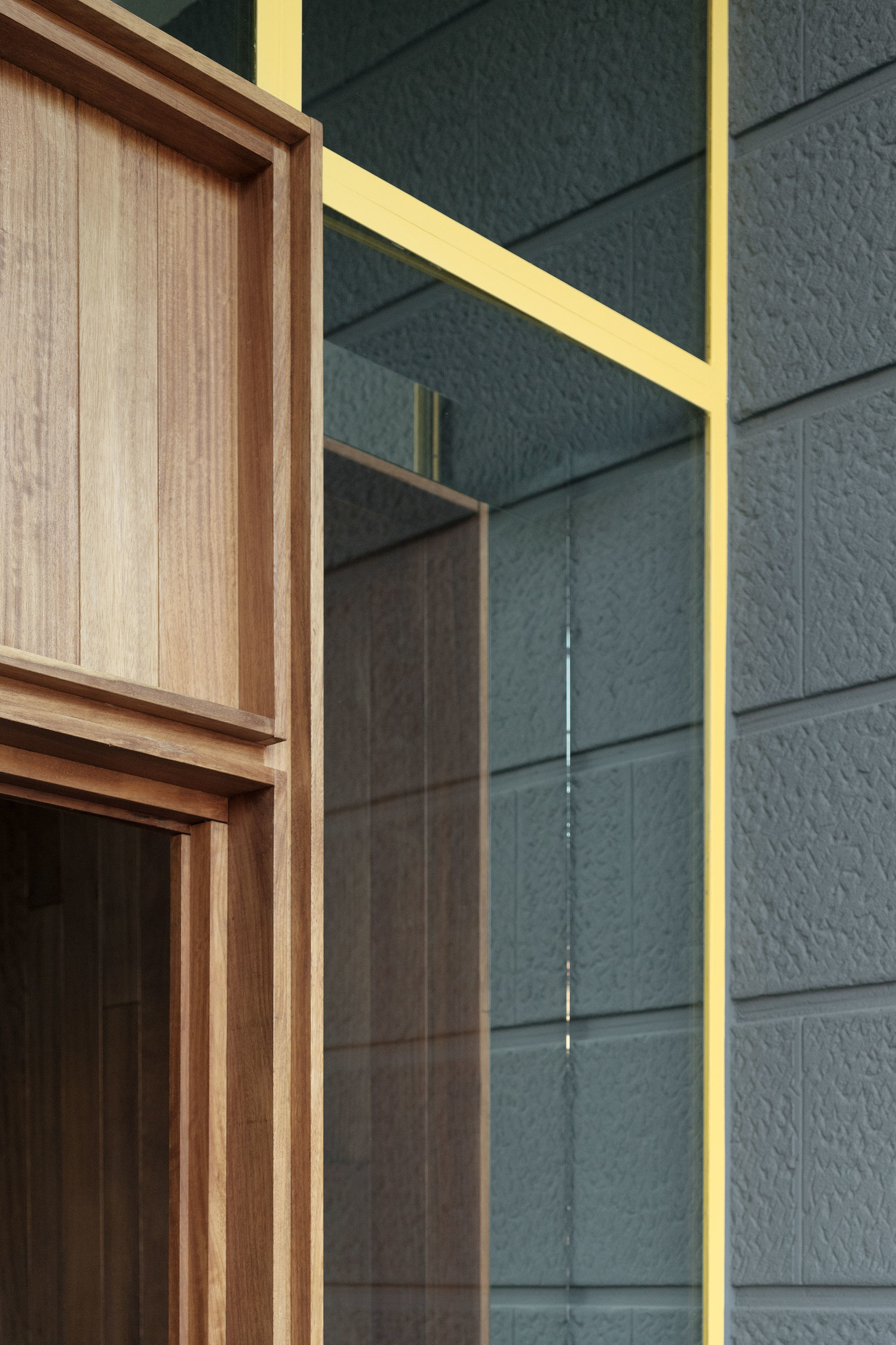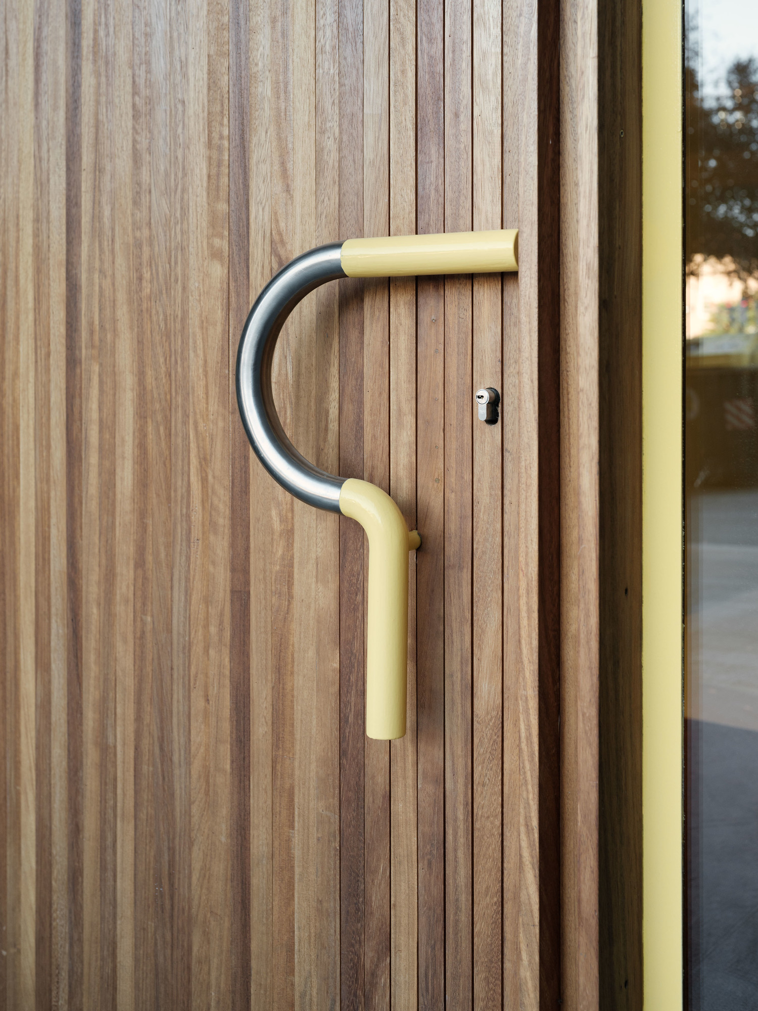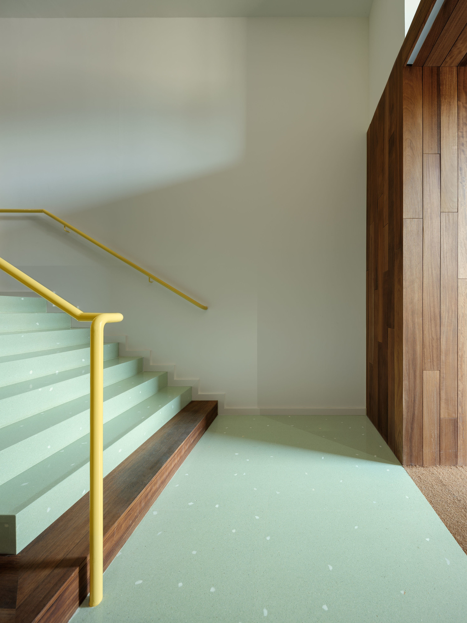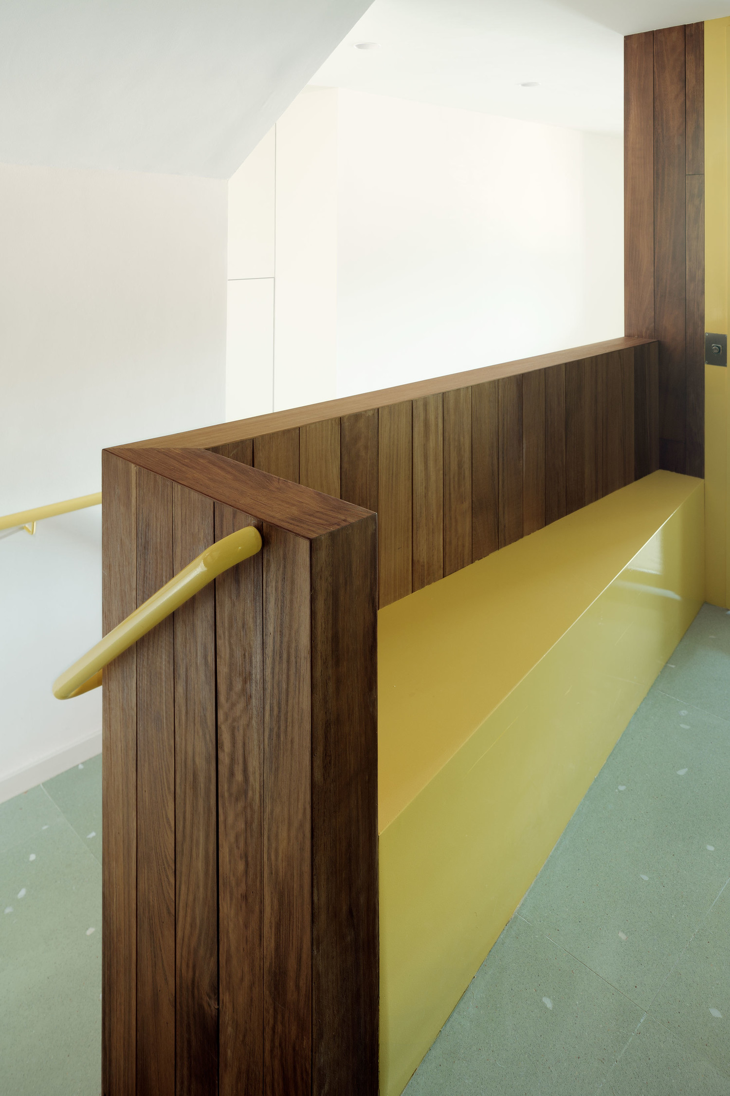 All this is completed with the performable elements, which are lit in yellow lacquer, standing out from the more neutral palette, seeking to be actuated by the users: handrails, mailboxes, doors, handles and a new bench in which to share a while.