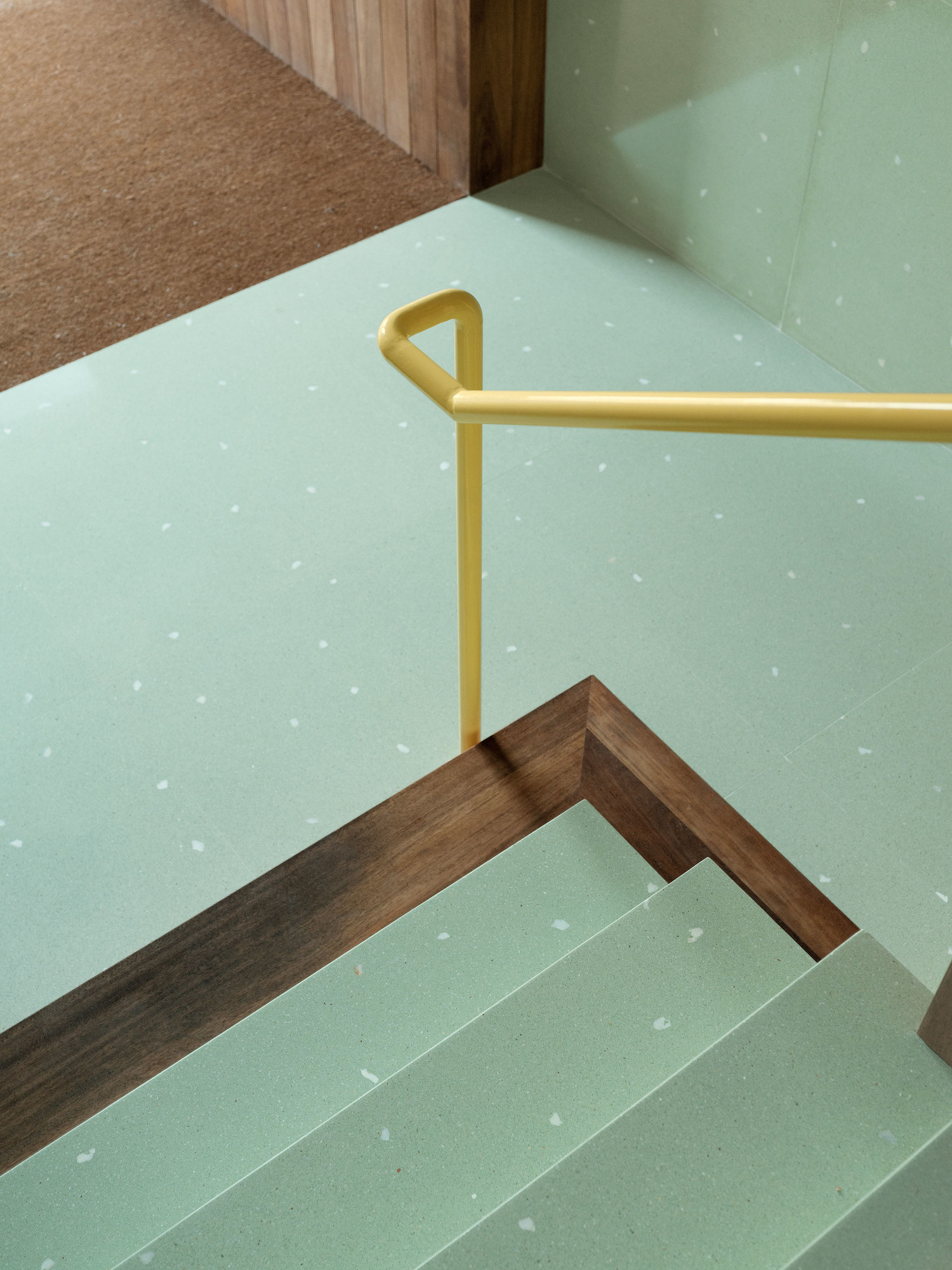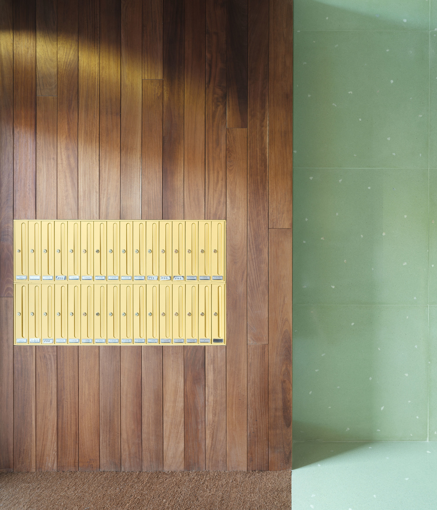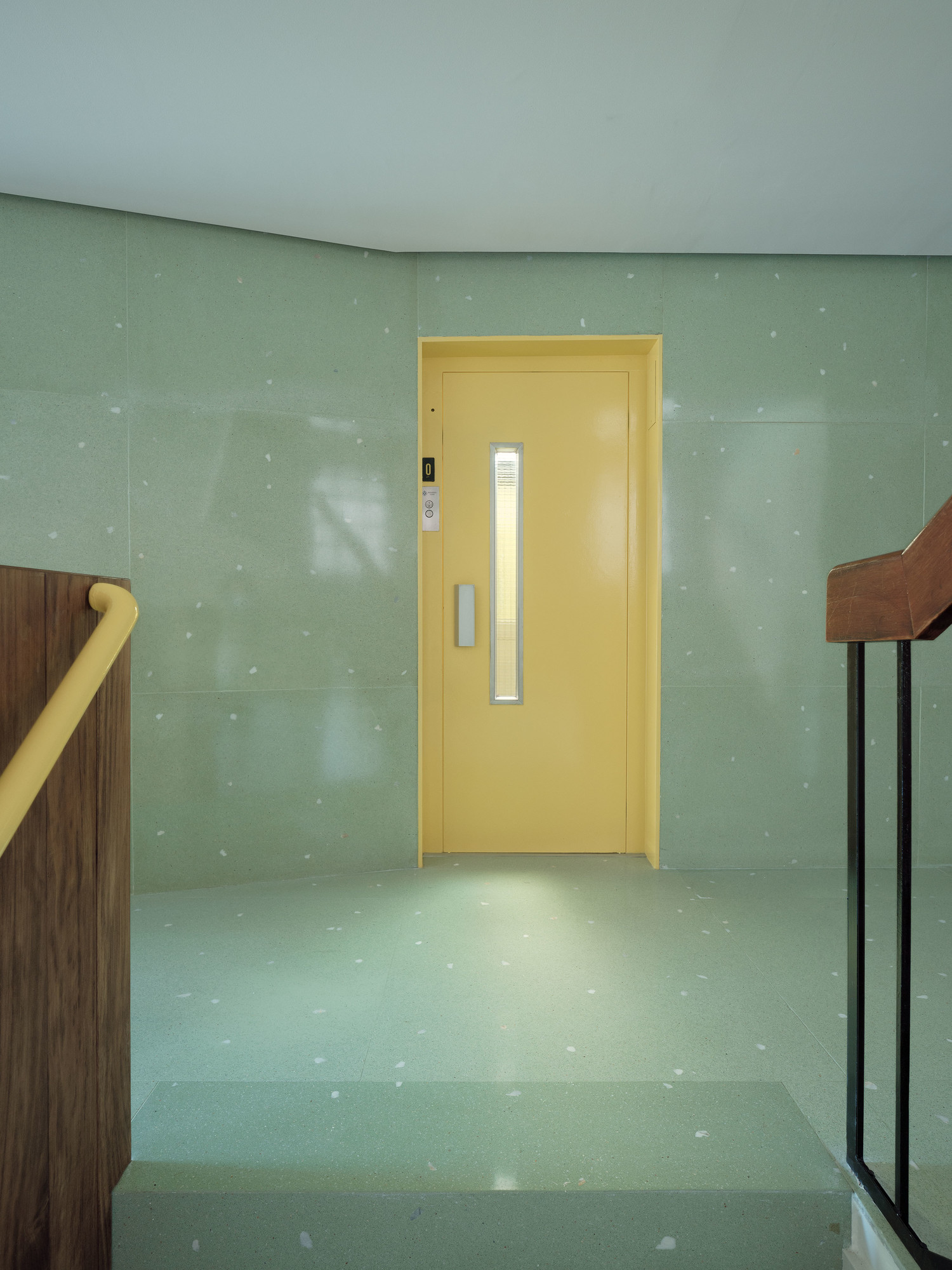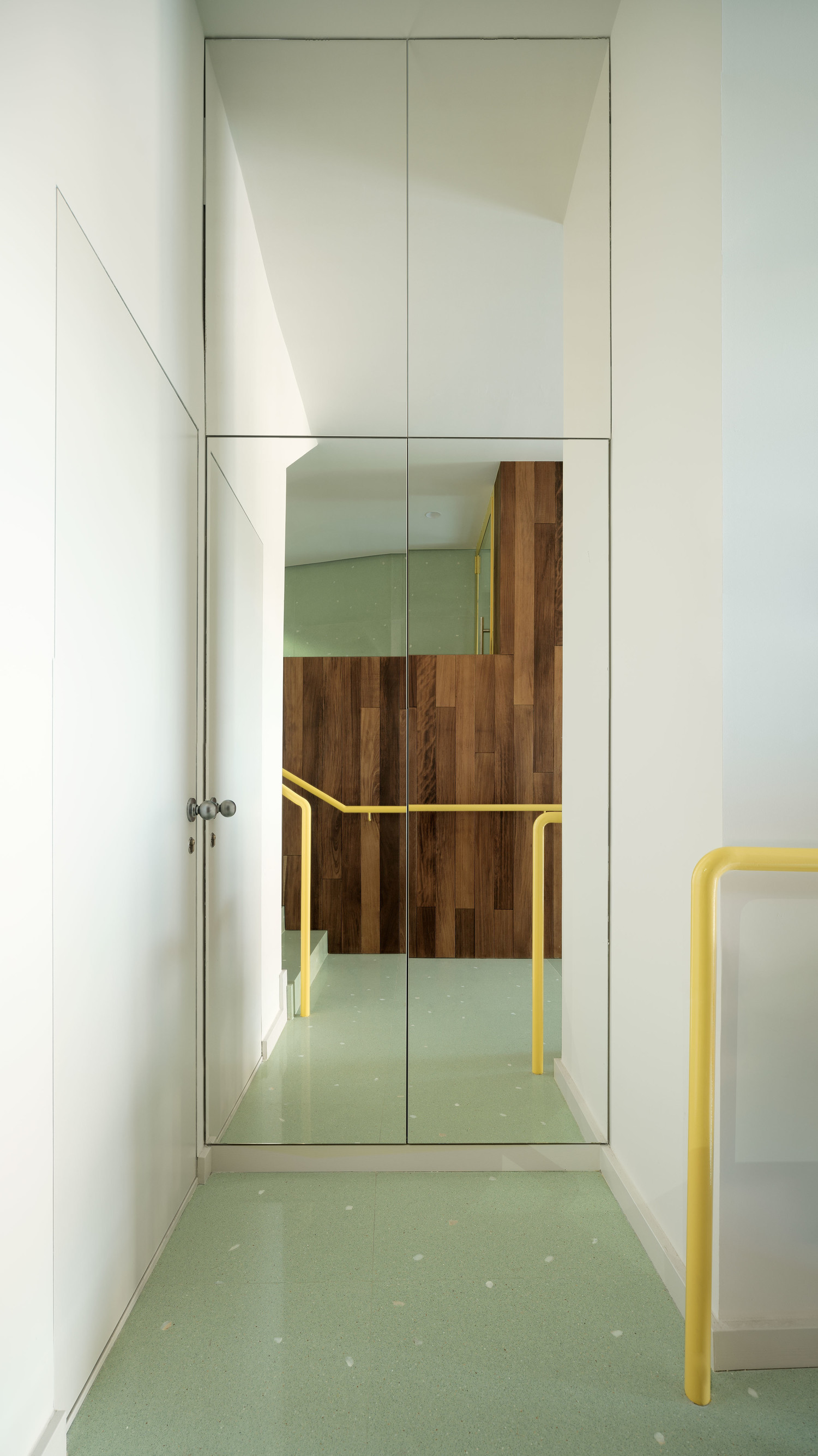 In this way, the project displays a palette of textures and colors that embrace pre-existence and surround it in search of a new atmosphere of optimism. The green terrazzo with white marble splashes traces a transitional canvas from the interior to the street, while Iroko wood container furniture includes the lift platform and the entrance diaphragm space. These pieces of furniture make up the space playing with heights, tied by the light that enters the deep space through a simple game of reflections and mirrors.