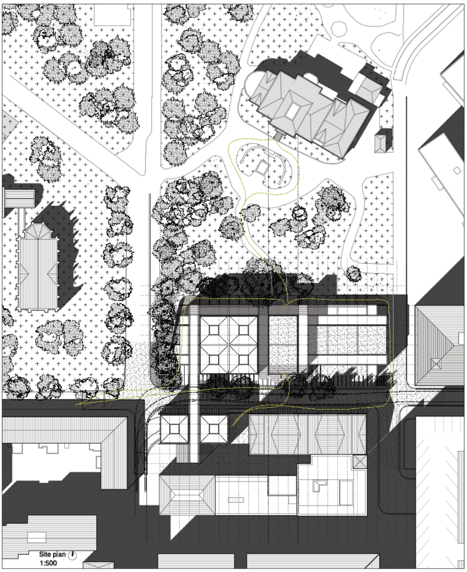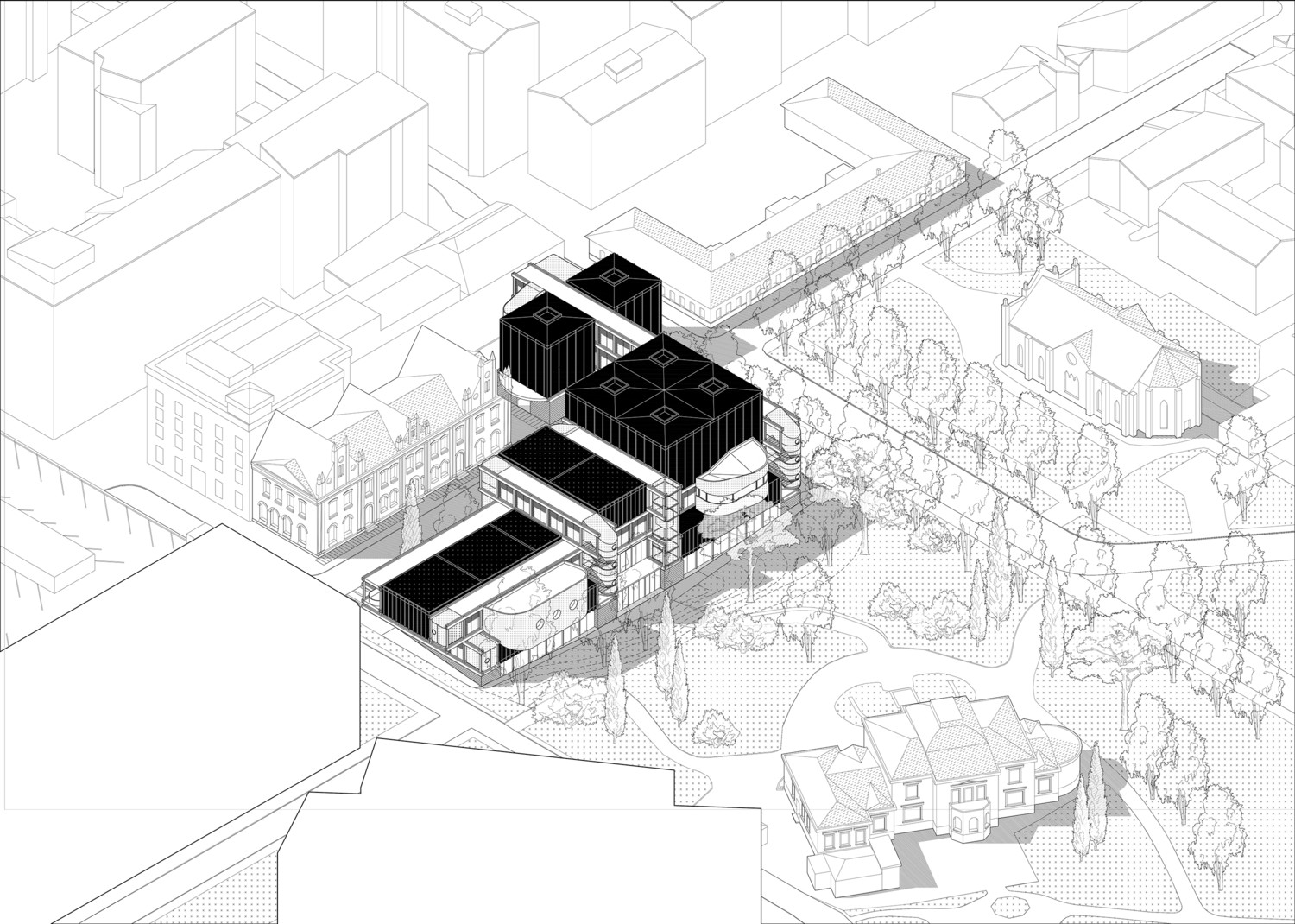 The architectural concept of the proposal takes the grid of the former weaving mill and, as in the tartan fabric, superposes the axes creating a superimposed grid in the transition from the rigid built alignments to the organic pathways through the soft green surfaces.
