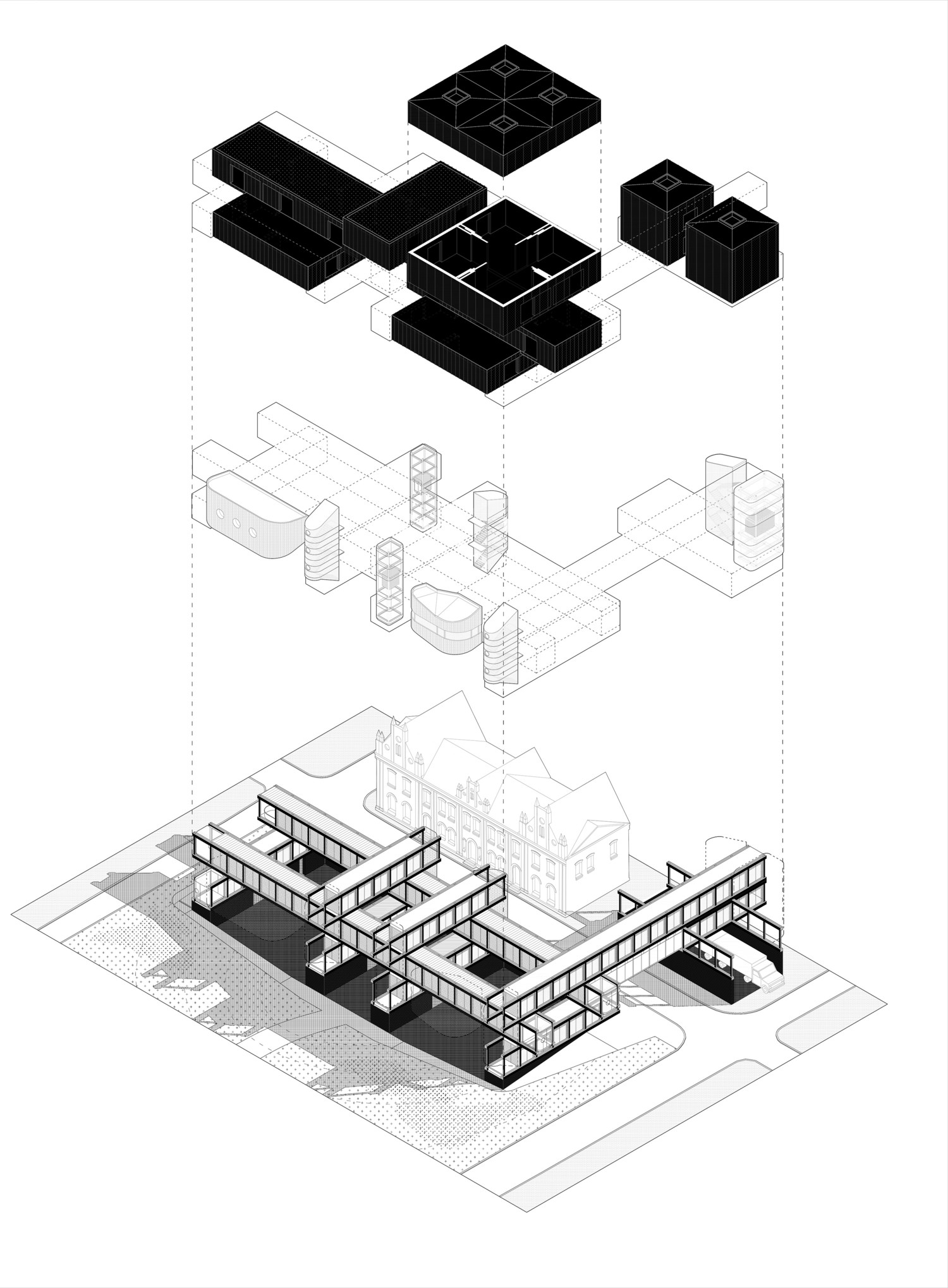 The structural grid displays the activity of the museum. The wandering visitors, users and participants are seen from the surrounding site inviting passers-by to join in. This grid of passages let direct access to exhibition halls and all the different facilities, workshop, vertical communications, restrooms that plug in. The grid is wide enough (3,5m) to allow the visitors a while to disconnect, host didactic contents or exhibit certain gadgets as vitrines or bases for small objects, sculptures or other interactive elements. This dichotomy between hall and passage provide a wider chance to different displaying resources.