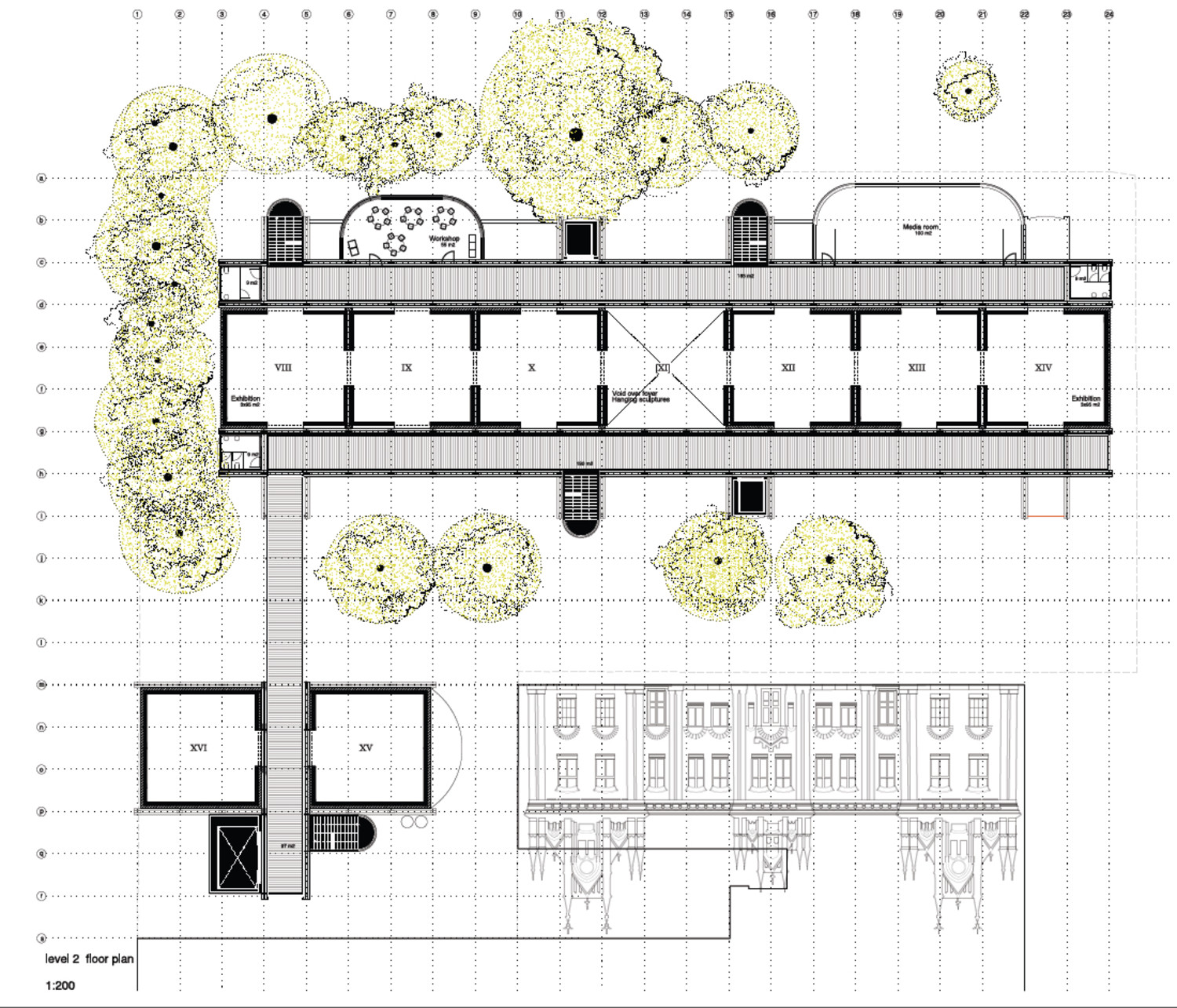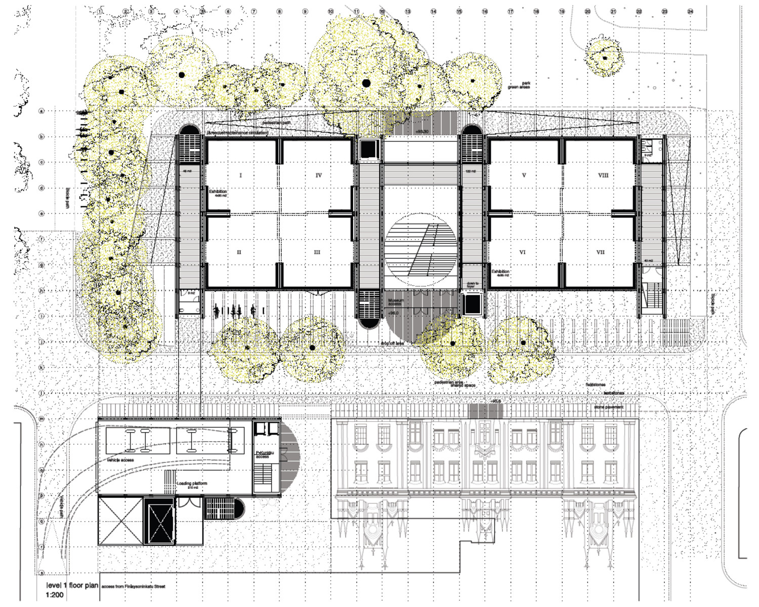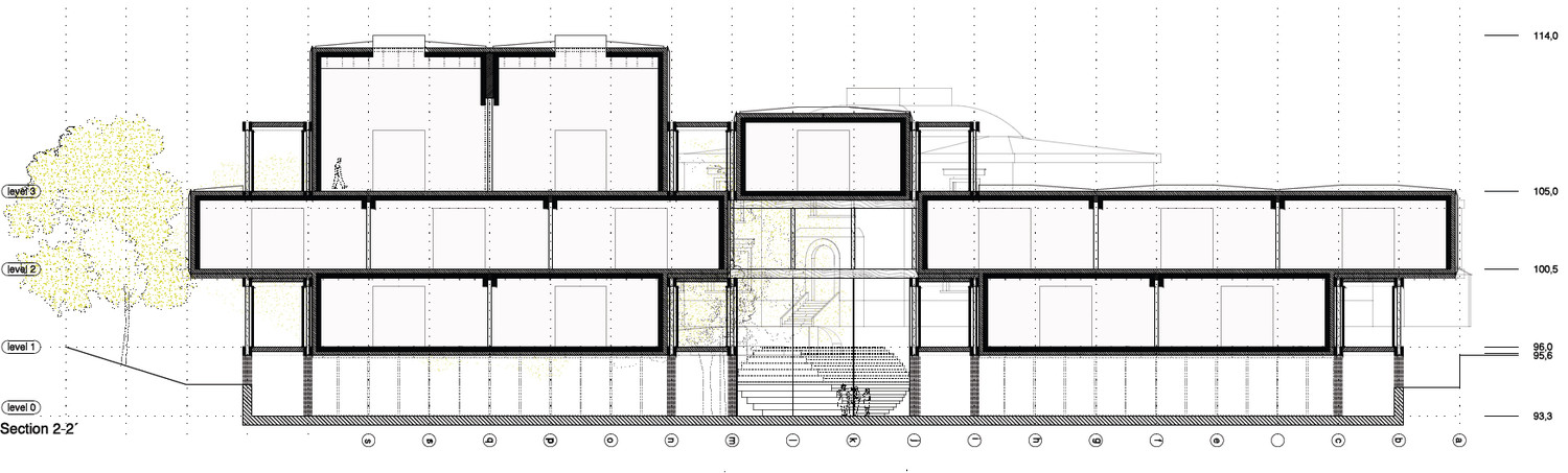 The solution to the exhibition programme is a set of combination of different sizes of modular halls. The exhibition rooms have broody controlled atmospheric qualities. The stacking volumes become higher in top floor and they all share a continuous grid of vertical shafts and circulations.The grid of structural galleries embraces the exhibition areas. These corridors function as a system of intermediate spaces with green efficiency qualities of maximum use of solar light, natural ventilation, tempering spaces. This grid offers the condition of being inside the museum being outside at the same time. To be seen while enjoying the surroundings.