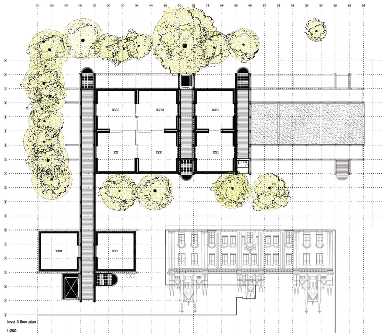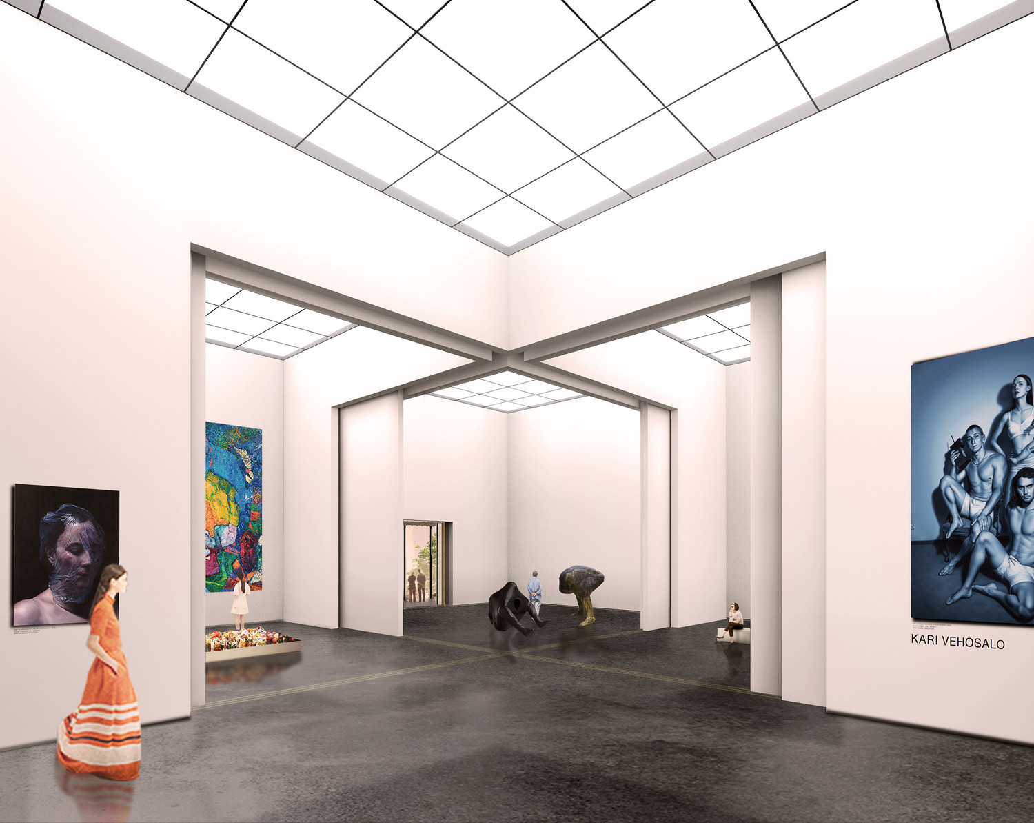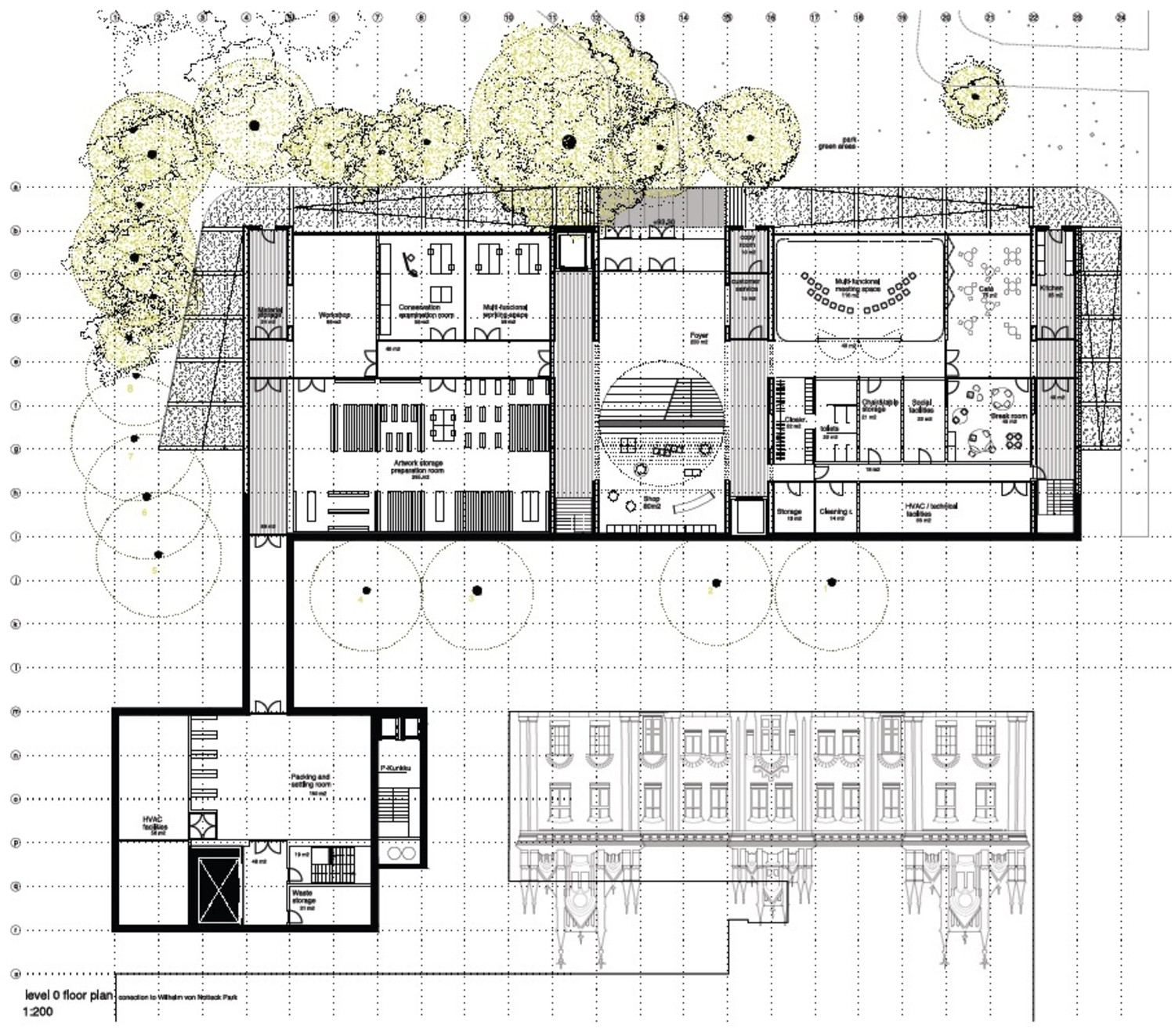 The solution to the exhibition programme is a set of combination of different sizes of modular halls. The exhibition rooms have broody controlled atmospheric qualities. The stacking volumes become higher in top floor and they all share a continuous grid of vertical shafts and circulations.The grid of structural galleries embraces the exhibition areas. These corridors function as a system of intermediate spaces with green efficiency qualities of maximum use of solar light, natural ventilation, tempering spaces. This grid offers the condition of being inside the museum being outside at the same time. To be seen while enjoying the surroundings.